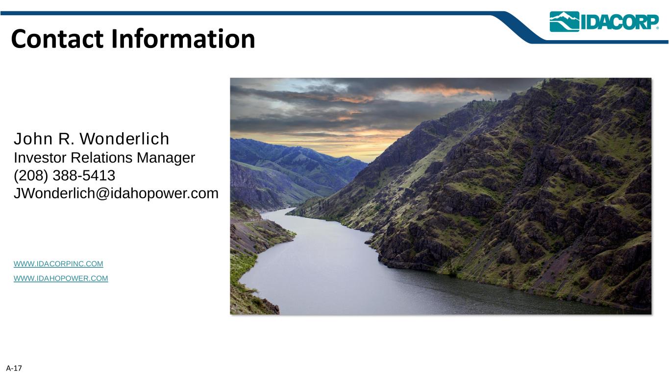 Contact Information WWW.IDACORPINC.COM WWW.IDAHOPOWER.COM John R. Wonderlich Investor Relations Manager (208) 388-5413 JWonderlich@idahopower.com A-17