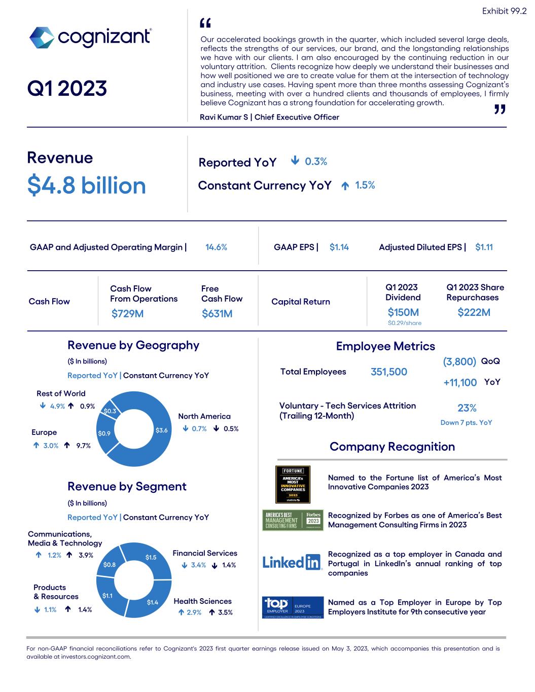 Our accelerated bookings growth in the quarter, which included several large deals, reflects the strengths of our services, our brand, and the longstanding relationships we have with our clients. I am also encouraged by the continuing reduction in our voluntary attrition. Clients recognize how deeply we understand their businesses and how well positioned we are to create value for them at the intersection of technology and industry use cases. Having spent more than three months assessing Cognizant’s business, meeting with over a hundred clients and thousands of employees, I firmly believe Cognizant has a strong foundation for accelerating growth. Q1 2023 Ravi Kumar S | Chief Executive Officer ” Revenue $4.8 billion Reported YoY ê 0.3% Constant Currency YoY é 1.5% GAAP and Adjusted Operating Margin | 14.6% GAAP EPS | $1.14 $3.6$0.9 $0.3 Rest of World 4.9% Revenue by Geography ($ In billions) Reported YoY | Constant Currency YoY Cash Flow Cash Flow From Operations $729M Free Cash Flow $631M Capital Return Q1 2023 Dividend $150M Q1 2023 Share Repurchases $222M $0.29/share Revenue by Segment ($ In billions) Reported YoY | Constant Currency YoY Europe North America 0.9% $1.5 $1.4 $1.1 $0.8 Products & Resources Health Sciences Financial Services Communications, Media & Technology 3.0% 9.7% 0.7% 0.5% 1.2% 3.9% 1.1% 1.4% 3.4% 1.4% 2.9% 3.5% Total Employees 351,500 ” For non-GAAP financial reconciliations refer to Cognizant's 2023 first quarter earnings release issued on May  3, 2023, which accompanies this presentation and is available at investors.cognizant.com. Exhibit 99.2 (3,800) QoQ +11,100 YoY Voluntary - Tech Services Attrition (Trailing 12-Month) 23% é é é é é é é é é é é é é é Adjusted Diluted EPS | $1.11 Employee Metrics Company Recognition Down 7 pts. YoY Named to the Fortune list of America’s Most Innovative Companies 2023 Recognized by Forbes as one of America’s Best Management Consulting Firms in 2023 Recognized as a top employer in Canada and Portugal in LinkedIn’s annual ranking of top companies Named as a Top Employer in Europe by Top Employers Institute for 9th consecutive year