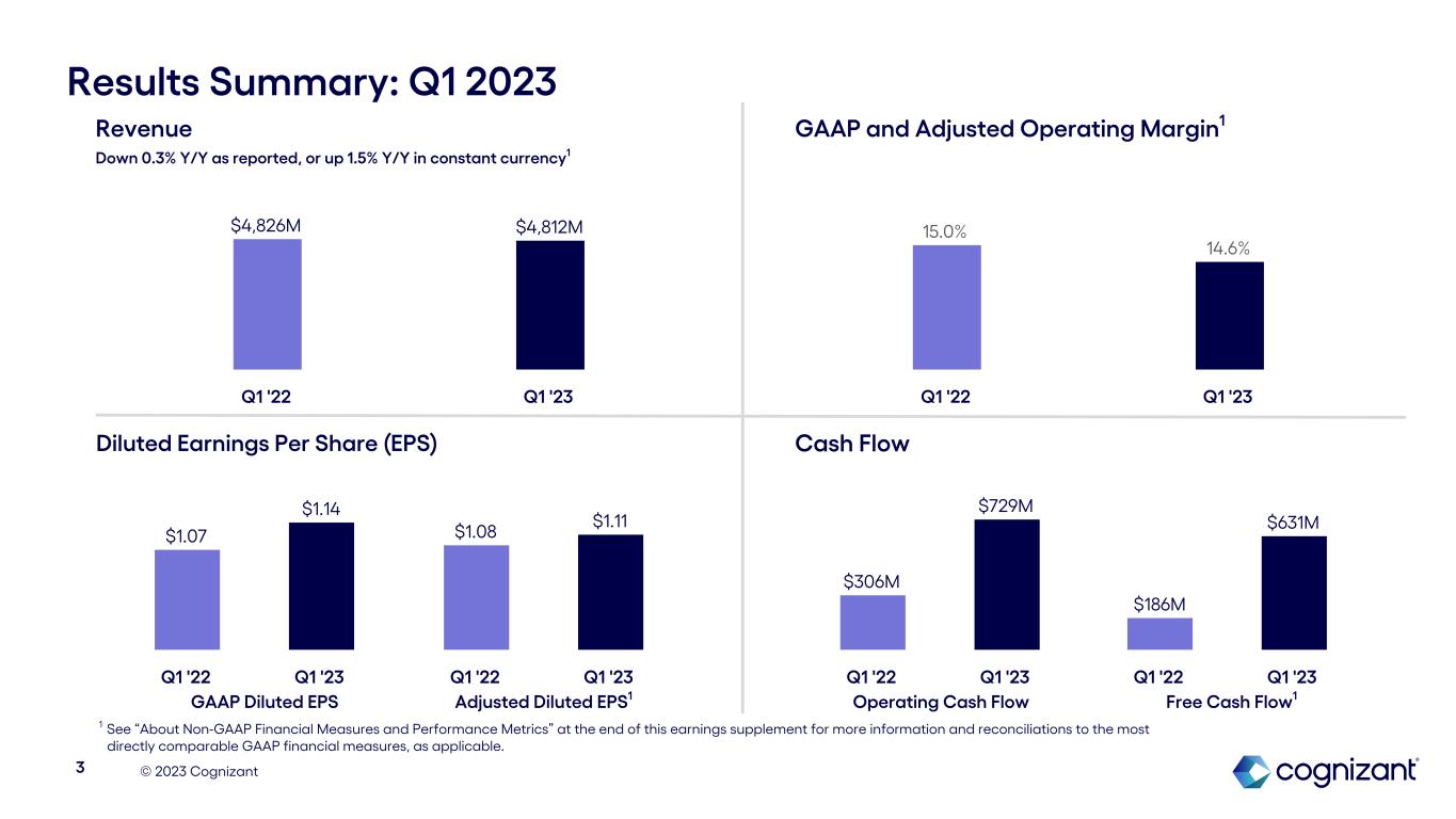 © 2023 Cognizant Forward-looking statements This earnings supplement includes statements that may constitute forward-looking statements made pursuant to the safe harbor provisions of the Private Securities Litigation Reform Act of 1995, the accuracy of which are necessarily subject to risks, uncertainties and assumptions as to future events that may not prove to be accurate. These statements include, but are not limited to, express or implied forward-looking statements relating to our expectations regarding our strategy, competitive position and opportunities in the marketplace, investment in and growth of our business, the effectiveness of our recruiting and talent efforts and related costs, labor market trends, the anticipated amount of capital to be returned to shareholders and our anticipated financial performance. These statements are neither promises nor guarantees, but are subject to a variety of risks and uncertainties, many of which are beyond our control, which could cause actual results to differ materially from those contemplated in these forward-looking statements. Existing and prospective investors are cautioned not to place undue reliance on these forward-looking statements, which speak only as of the date hereof. Factors that could cause actual results to differ materially from those expressed or implied include general economic conditions, the competitive and rapidly changing nature of the markets we compete in, the competitive marketplace for talent and its impact on employee recruitment and retention, our ability to successfully implement our NextGen program and the amount of costs, timing of incurring costs and ultimate benefits of such plans, legal, reputational and financial risks resulting from cyberattacks, risks related to the invasion of Ukraine by Russia, changes in the regulatory environment, including with respect to immigration and taxes, and the other factors discussed in our most recent Annual Report on Form 10-K and other filings with the Securities and Exchange Commission. Cognizant undertakes no obligation to update or revise any forward looking statements, whether as a result of new information, future events, or otherwise, except as may be required under applicable securities law. 2