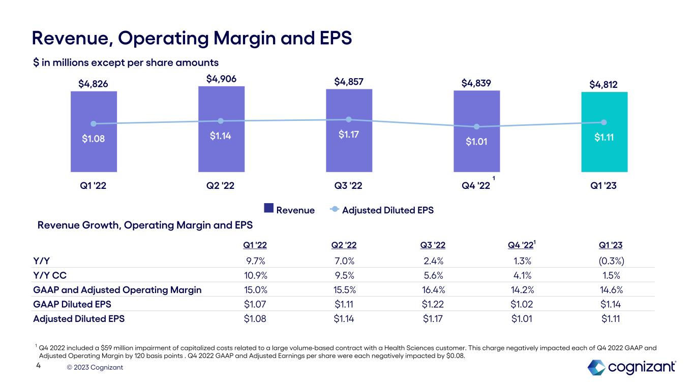 © 2023 Cognizant Results Summary: Q1 2023 1 See “About Non-GAAP Financial Measures and Performance Metrics” at the end of this earnings supplement for more information and reconciliations to the most directly comparable GAAP financial measures, as applicable. Revenue Down 0.3% Y/Y as reported, or up 1.5% Y/Y in constant currency1 GAAP and Adjusted Operating Margin1 Cash Flow 3 $4,826M $4,812M Q1 '22 Q1 '23 Diluted Earnings Per Share (EPS) 15.0% 14.6% Q1 '22 Q1 '23 15.0% 14.6% Q1 '22 Q1 '23 $306M $729M Q1 '22 Q1 '23 $186M $631M Q1 '22 Q1 '23 $1.07 $1.14 Q1 '22 Q1 '23 $1.08 $1.11 Q1 '22 Q1 '23 Adjusted Operating Margin1 GAAP Diluted EPS Adjusted Diluted EPS1 Operating Cash Flow Free Cash Flow1 GAAP Operating Margin Adjusted Operating Margin1