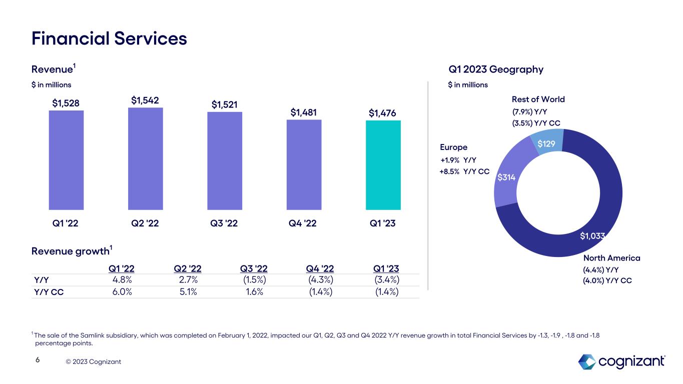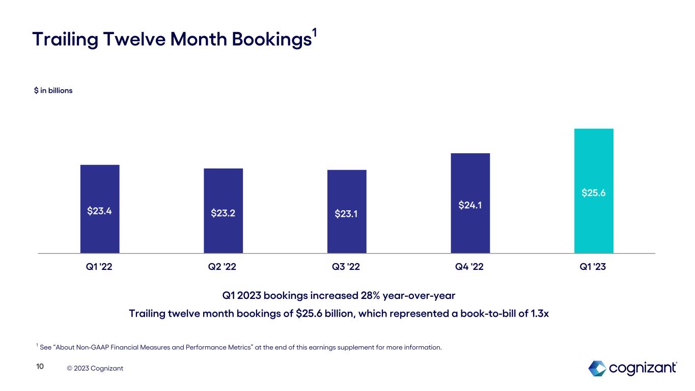 © 2023 Cognizant $3,545 $939 $328 $1,476 $1,433 $1,118 $785 Revenue Performance: Q1 2023 Products & Resources Communications, Media & Technology Health Sciences Financial Services North America Europe Rest of World Segments $ in millions Geography $ in millions +1.2% Y/Y +3.9% Y/Y (1.1%) Y/Y +1.4% Y/Y CC +2.9% Y/Y +3.5% Y/Y CC (3.4%) Y/Y (1.4%) Y/Y CC +3.0% Y/Y +9.7% Y/Y CC (4.9%) Y/Y +0.9% Y/Y CC (0.7%) Y/Y (0.5%) Y/Y CC 5