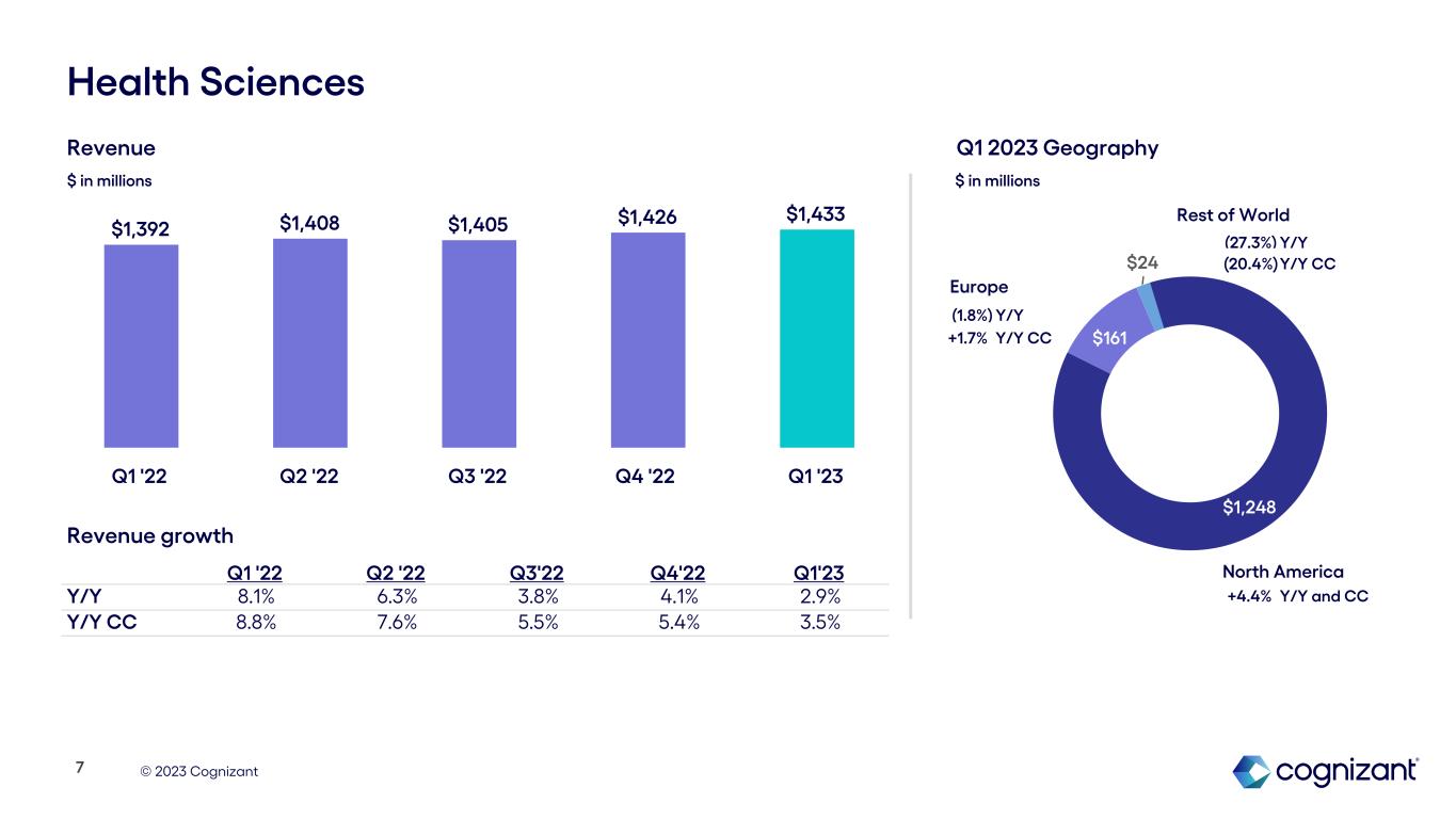 © 2023 Cognizant $1,033 $314 $129 Financial Services North America Europe Rest of World Q1 '22 Q2 '22 Q3 '22 Q4 '22 Q1 '23 Y/Y 4.8% 2.7% (1.5%) (4.3%) (3.4%) Y/Y CC 6.0% 5.1% 1.6% (1.4%) (1.4%) (7.9%) Y/Y (3.5%) Y/Y CC +1.9% Y/Y +8.5% Y/Y CC Revenue1 Revenue growth1 $ in millions $ in millions Q1 2023 Geography (4.4%) Y/Y (4.0%) Y/Y CC $1,528 $1,542 $1,521 $1,481 $1,476 Q1 '22 Q2 '22 Q3 '22 Q4 '22 Q1 '23 6 1 The sale of the Samlink subsidiary, which was completed on February 1, 2022, impacted our Q1, Q2, Q3 and Q4 2022 Y/Y revenue growth in total Financial Services by -1.3, -1.9 , -1.8 and -1.8 percentage points.