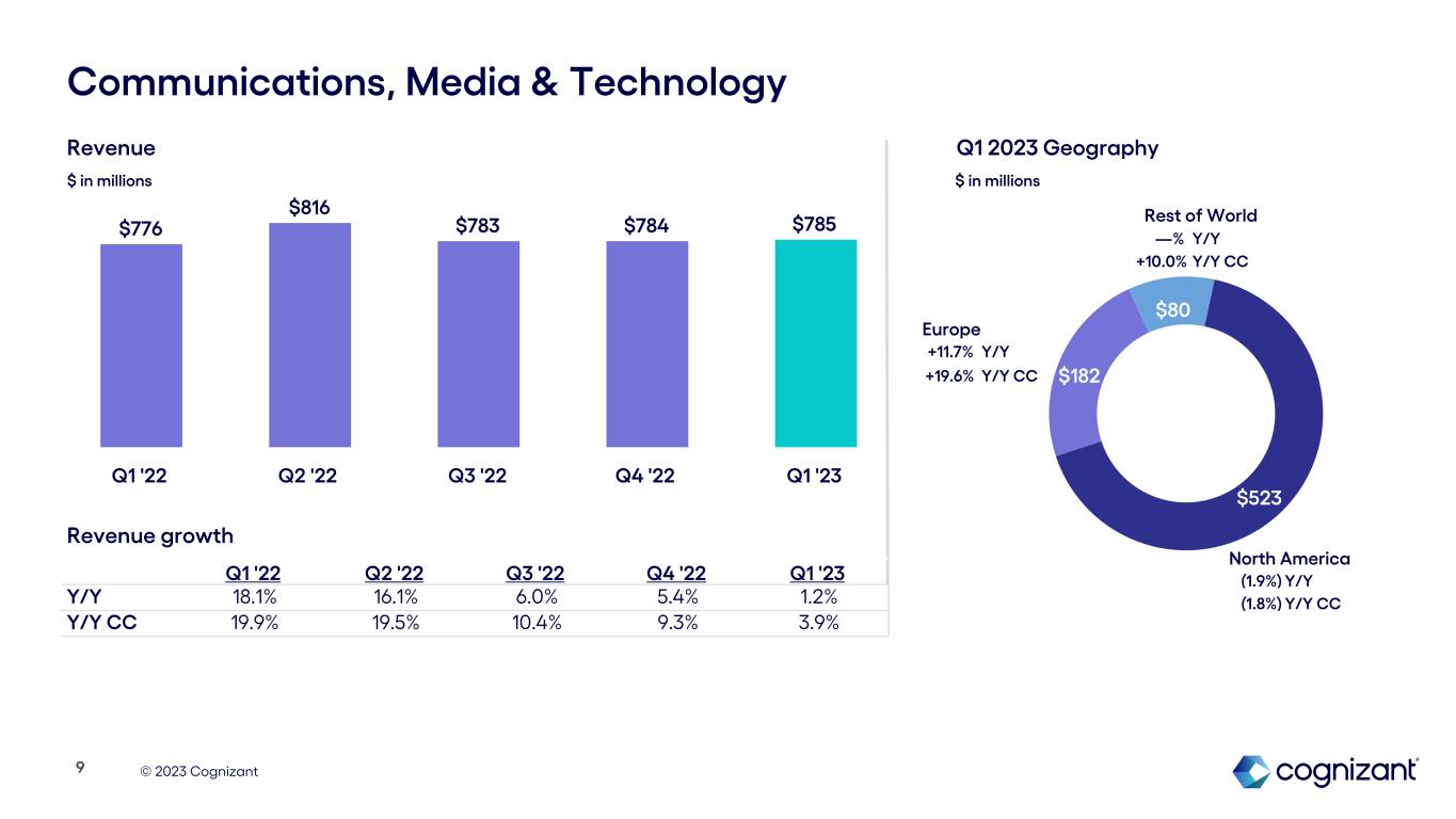 © 2023 Cognizant $741 $282 $95 North America Europe Products & Resources (2.6%) Y/Y (2.5%) Y/Y CC +1.8% Y/Y +10.0% Y/Y CC +3.3% Y/Y +7.6% Y/Y CC Rest of World Revenue $ in millions Q1 '22 Q2 '22 Q3 '22 Q4 '22 Q1 '23 Y/Y 13.2% 8.1% 3.7% 2.9% (1.1%) Y/Y CC 14.9% 11.6% 8.2% 6.8% 1.4% $1,130 $1,140 $1,148 $1,148 $1,118 Q1 '22 Q2 '22 Q3 '22 Q4 '22 Q1 '23 8 Revenue growth $ in millions Q1 2023 Geography
