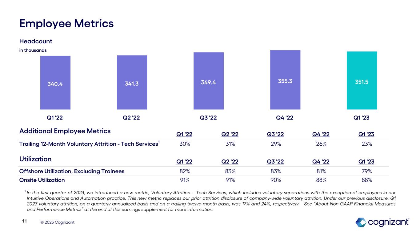 © 2023 Cognizant Employee Metrics 340.4 341.3 349.4 355.3 351.5 Q1 '22 Q2 '22 Q3 '22 Q4 '22 Q1 '23 11 Q1 '22 Q2 '22 Q3 '22 Q4 '22 Q1 '23 Trailing 12-Month Voluntary Attrition - Tech Services1 30% 31% 29% 26% 23% Additional Employee Metrics Q1 '22 Q2 '22 Q3 '22 Q4 '22 Q1 '23 Offshore Utilization, Excluding Trainees 82% 83% 83% 81% 79% Onsite Utilization 91% 91% 90% 88% 88% Utilization Headcount in thousands 1 In the first quarter of 2023, we introduced a new metric, Voluntary Attrition – Tech Services, which includes voluntary separations with the exception of employees in our Intuitive Operations and Automation practice. This new metric replaces our prior attrition disclosure of company-wide voluntary attrition. Under our previous disclosure, Q1 2023 voluntary attrition, on a quarterly annualized basis and on a trailing-twelve-month basis, was 17% and 24%, respectively.  See “About Non-GAAP Financial Measures and Performance Metrics” at the end of this earnings supplement for more information.
