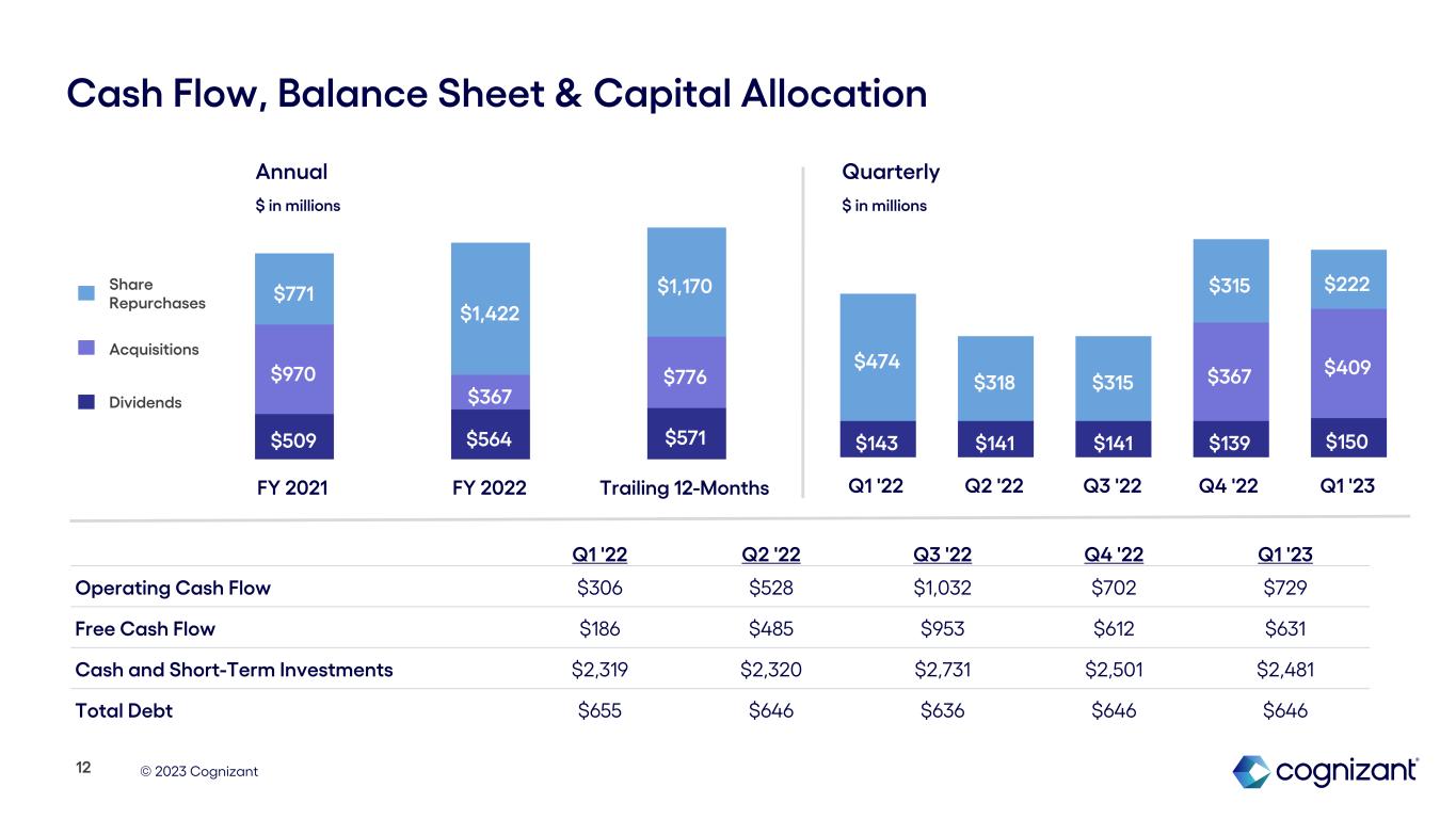 © 2023 Cognizant $509 $564 $571 $970 $367 $776 $771 $1,422 $1,170 FY 2021 FY 2022 Trailing 12-Months Acquisitions Share Repurchases $143 $141 $141 $139 $150 $367 $409$474 $318 $315 $315 $222 Q1 '22 Q2 '22 Q3 '22 Q4 '22 Q1 '23 Cash Flow, Balance Sheet & Capital Allocation Q1 '22 Q2 '22 Q3 '22 Q4 '22 Q1 '23 Operating Cash Flow $306 $528 $1,032 $702 $729 Free Cash Flow $186 $485 $953 $612 $631 Cash and Short-Term Investments $2,319 $2,320 $2,731 $2,501 $2,481 Total Debt $655 $646 $636 $646 $646 Annual Quarterly Dividends 12 $ in millions $ in millions