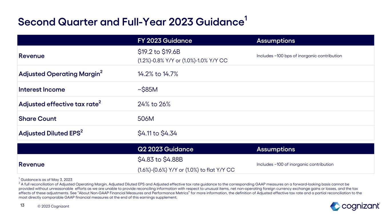 © 2023 Cognizant Second Quarter and Full-Year 2023 Guidance1 1 Guidance is as of May 3, 2023 2 A full reconciliation of Adjusted Operating Margin, Adjusted Diluted EPS and Adjusted effective tax rate guidance to the corresponding GAAP measures on a forward-looking basis cannot be provided without unreasonable efforts as we are unable to provide reconciling information with respect to unusual items, net non-operating foreign currency exchange gains or losses, and the tax effects of these adjustments. See “About Non-GAAP Financial Measures and Performance Metrics” for more information, the definition of Adjusted effective tax rate and a partial reconciliation to the most directly comparable GAAP financial measures at the end of this earnings supplement. Q2 2023 Guidance Assumptions Revenue $4.83 to $4.88B (1.6%)-(0.6%) Y/Y or (1.0%) to flat Y/Y CC Includes ~100 of inorganic contribution 13 FY 2023 Guidance Assumptions Revenue $19.2 to $19.6B (1.2%)-0.8% Y/Y or (1.0%)-1.0% Y/Y CC Includes ~100 bps of inorganic contribution Adjusted Operating Margin2 14.2% to 14.7% Interest Income ~$85M Adjusted effective tax rate2 24% to 26% Share Count 506M Adjusted Diluted EPS2 $4.11 to $4.34