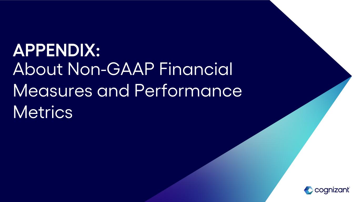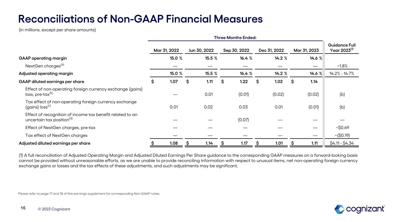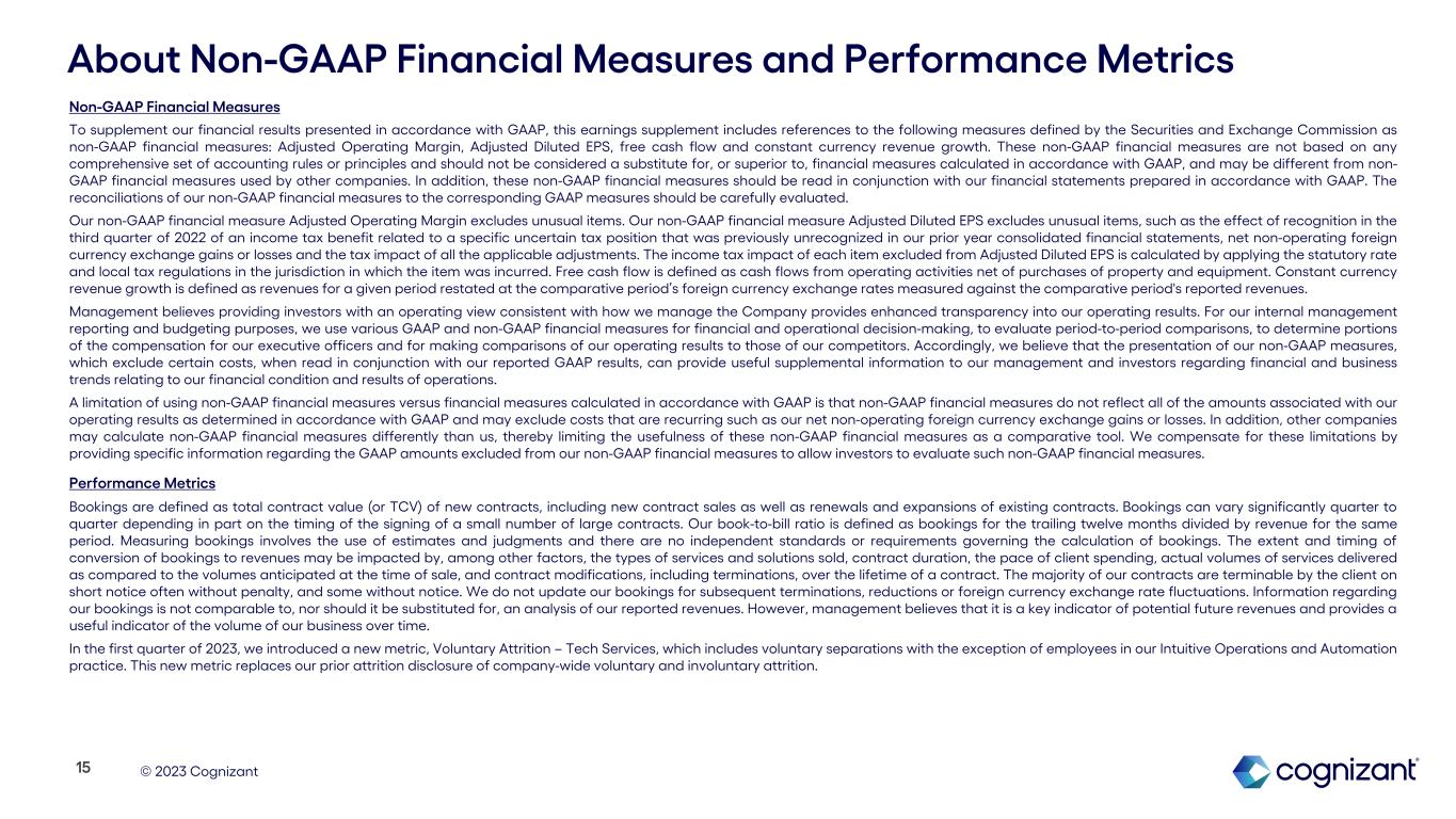 © 2023 Cognizant Non-GAAP Financial Measures To supplement our financial results presented in accordance with GAAP, this earnings supplement includes references to the following measures defined by the Securities and Exchange Commission as non-GAAP financial measures: Adjusted Operating Margin, Adjusted Diluted EPS, free cash flow and constant currency revenue growth. These non-GAAP financial measures are not based on any comprehensive set of accounting rules or principles and should not be considered a substitute for, or superior to, financial measures calculated in accordance with GAAP, and may be different from non- GAAP financial measures used by other companies. In addition, these non-GAAP financial measures should be read in conjunction with our financial statements prepared in accordance with GAAP. The reconciliations of our non-GAAP financial measures to the corresponding GAAP measures should be carefully evaluated. Our non-GAAP financial measure Adjusted Operating Margin excludes unusual items. Our non-GAAP financial measure Adjusted Diluted EPS excludes unusual items, such as the effect of recognition in the third quarter of 2022 of an income tax benefit related to a specific uncertain tax position that was previously unrecognized in our prior year consolidated financial statements, net non-operating foreign currency exchange gains or losses and the tax impact of all the applicable adjustments. The income tax impact of each item excluded from Adjusted Diluted EPS is calculated by applying the statutory rate and local tax regulations in the jurisdiction in which the item was incurred. Free cash flow is defined as cash flows from operating activities net of purchases of property and equipment. Constant currency revenue growth is defined as revenues for a given period restated at the comparative period’s foreign currency exchange rates measured against the comparative period's reported revenues. Management believes providing investors with an operating view consistent with how we manage the Company provides enhanced transparency into our operating results. For our internal management reporting and budgeting purposes, we use various GAAP and non-GAAP financial measures for financial and operational decision-making, to evaluate period-to-period comparisons, to determine portions of the compensation for our executive officers and for making comparisons of our operating results to those of our competitors. Accordingly, we believe that the presentation of our non-GAAP measures, which exclude certain costs, when read in conjunction with our reported GAAP results, can provide useful supplemental information to our management and investors regarding financial and business trends relating to our financial condition and results of operations. A limitation of using non-GAAP financial measures versus financial measures calculated in accordance with GAAP is that non-GAAP financial measures do not reflect all of the amounts associated with our operating results as determined in accordance with GAAP and may exclude costs that are recurring such as our net non-operating foreign currency exchange gains or losses. In addition, other companies may calculate non-GAAP financial measures differently than us, thereby limiting the usefulness of these non-GAAP financial measures as a comparative tool. We compensate for these limitations by providing specific information regarding the GAAP amounts excluded from our non-GAAP financial measures to allow investors to evaluate such non-GAAP financial measures. Performance Metrics Bookings are defined as total contract value (or TCV) of new contracts, including new contract sales as well as renewals and expansions of existing contracts. Bookings can vary significantly quarter to quarter depending in part on the timing of the signing of a small number of large contracts. Our book-to-bill ratio is defined as bookings for the trailing twelve months divided by revenue for the same period. Measuring bookings involves the use of estimates and judgments and there are no independent standards or requirements governing the calculation of bookings. The extent and timing of conversion of bookings to revenues may be impacted by, among other factors, the types of services and solutions sold, contract duration, the pace of client spending, actual volumes of services delivered as compared to the volumes anticipated at the time of sale, and contract modifications, including terminations, over the lifetime of a contract. The majority of our contracts are terminable by the client on short notice often without penalty, and some without notice. We do not update our bookings for subsequent terminations, reductions or foreign currency exchange rate fluctuations. Information regarding our bookings is not comparable to, nor should it be substituted for, an analysis of our reported revenues. However, management believes that it is a key indicator of potential future revenues and provides a useful indicator of the volume of our business over time. In the first quarter of 2023, we introduced a new metric, Voluntary Attrition – Tech Services, which includes voluntary separations with the exception of employees in our Intuitive Operations and Automation practice. This new metric replaces our prior attrition disclosure of company-wide voluntary and involuntary attrition. About Non-GAAP Financial Measures and Performance Metrics 15