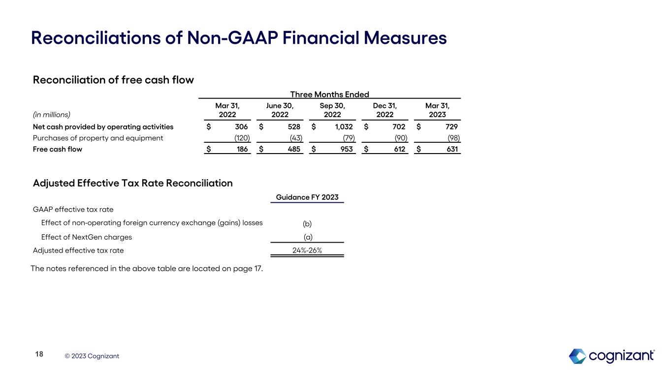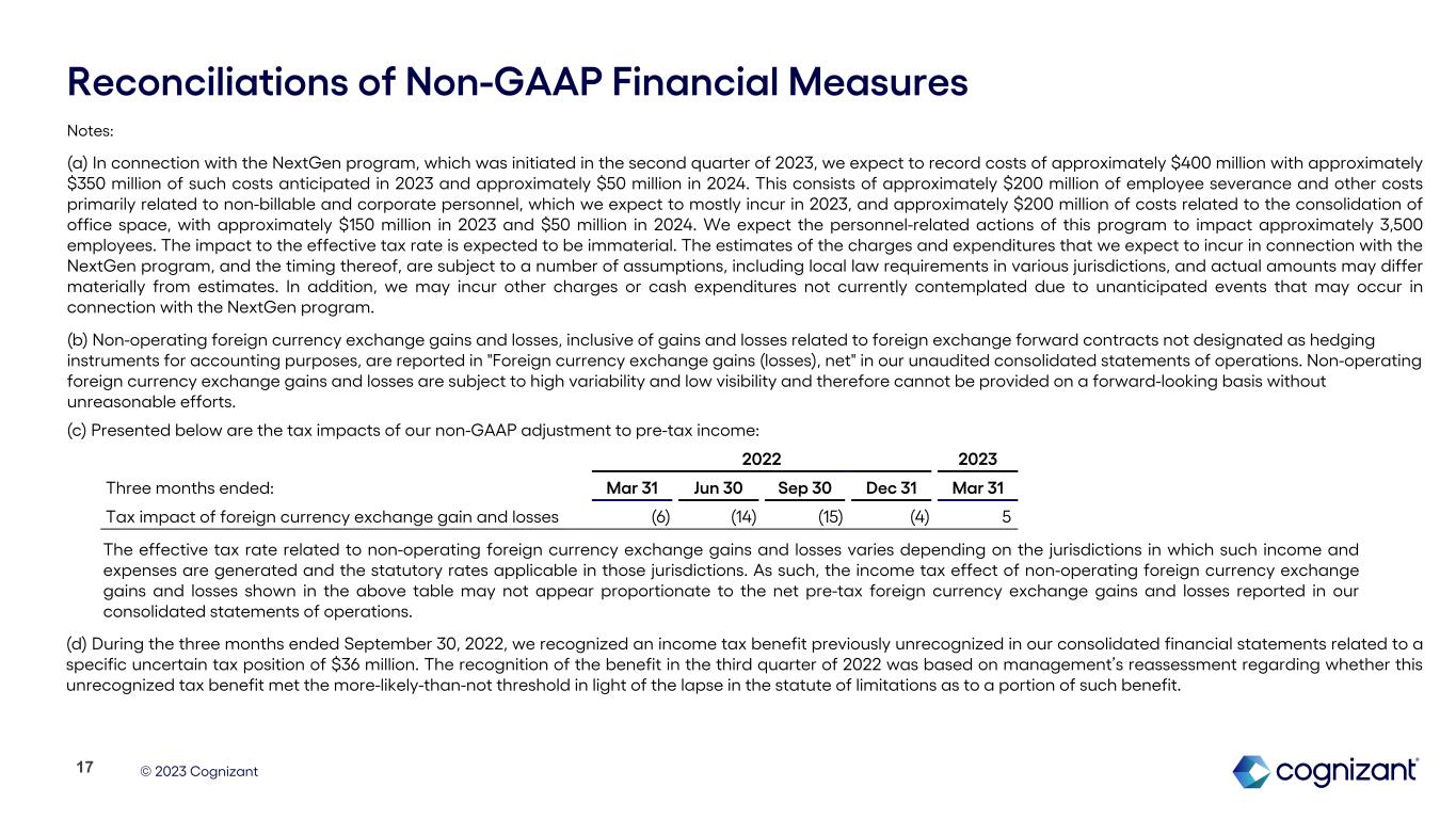 © 2023 Cognizant Reconciliations of Non-GAAP Financial Measures Notes: (a) In connection with the NextGen program, which was initiated in the second quarter of 2023, we expect to record costs of approximately $400 million with approximately $350 million of such costs anticipated in 2023 and approximately $50 million in 2024. This consists of approximately $200 million of employee severance and other costs primarily related to non-billable and corporate personnel, which we expect to mostly incur in 2023, and approximately $200 million of costs related to the consolidation of office space, with approximately $150 million in 2023 and $50 million in 2024. We expect the personnel-related actions of this program to impact approximately 3,500 employees. The impact to the effective tax rate is expected to be immaterial. The estimates of the charges and expenditures that we expect to incur in connection with the NextGen program, and the timing thereof, are subject to a number of assumptions, including local law requirements in various jurisdictions, and actual amounts may differ materially from estimates. In addition, we may incur other charges or cash expenditures not currently contemplated due to unanticipated events that may occur in connection with the NextGen program. (b) Non-operating foreign currency exchange gains and losses, inclusive of gains and losses related to foreign exchange forward contracts not designated as hedging instruments for accounting purposes, are reported in "Foreign currency exchange gains (losses), net" in our unaudited consolidated statements of operations. Non-operating foreign currency exchange gains and losses are subject to high variability and low visibility and therefore cannot be provided on a forward-looking basis without unreasonable efforts. 17 (d) During the three months ended September 30, 2022, we recognized an income tax benefit previously unrecognized in our consolidated financial statements related to a specific uncertain tax position of $36 million. The recognition of the benefit in the third quarter of 2022 was based on management’s reassessment regarding whether this unrecognized tax benefit met the more-likely-than-not threshold in light of the lapse in the statute of limitations as to a portion of such benefit. 2022 2023 Three months ended: Mar 31 Jun 30 Sep 30 Dec 31 Mar 31 Tax impact of foreign currency exchange gain and losses (6) (14) (15) (4) 5 (c) Presented below are the tax impacts of our non-GAAP adjustment to pre-tax income: The effective tax rate related to non-operating foreign currency exchange gains and losses varies depending on the jurisdictions in which such income and expenses are generated and the statutory rates applicable in those jurisdictions. As such, the income tax effect of non-operating foreign currency exchange gains and losses shown in the above table may not appear proportionate to the net pre-tax foreign currency exchange gains and losses reported in our consolidated statements of operations.