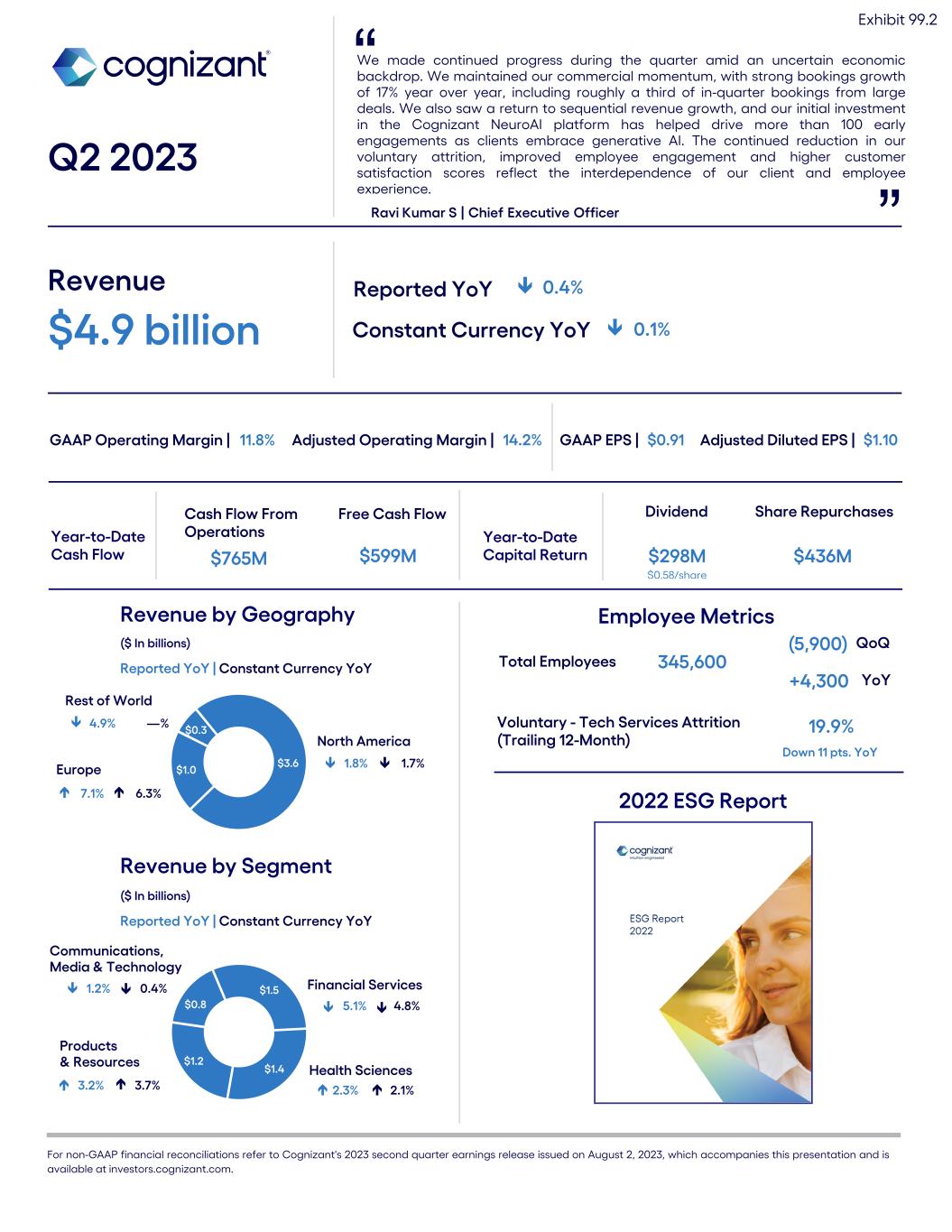 We made continued progress during the quarter amid an uncertain economic backdrop. We maintained our commercial momentum, with strong bookings growth of 17% year over year, including roughly a third of in-quarter bookings from large deals. We also saw a return to sequential revenue growth, and our initial investment in the Cognizant NeuroAI platform has helped drive more than 100 early engagements as clients embrace generative AI. The continued reduction in our voluntary attrition, improved employee engagement and higher customer satisfaction scores reflect the interdependence of our client and employee experience. Q2 2023 Ravi Kumar S | Chief Executive Officer ” Revenue $4.9 billion Reported YoY ê 0.4% Constant Currency YoY ê 0.1% GAAP Operating Margin | 11.8% GAAP EPS | $0.91 $3.6$1.0 $0.3 Rest of World 4.9% Revenue by Geography ($ In billions) Reported YoY | Constant Currency YoY Year-to-Date Cash Flow Cash Flow From Operations $765M Free Cash Flow $599M Year-to-Date Capital Return Dividend $298M Share Repurchases $436M $0.58/share Revenue by Segment ($ In billions) Reported YoY | Constant Currency YoY Europe North America —% $1.5 $1.4 $1.2 $0.8 Products & Resources Health Sciences Financial Services Communications, Media & Technology 7.1% 6.3% 1.8% 1.7% 1.2% 0.4% 3.2% 3.7% 5.1% 4.8% 2.3% 2.1% Total Employees 345,600 ” For non-GAAP financial reconciliations refer to Cognizant's 2023 second quarter earnings release issued on August 2, 2023, which accompanies this presentation and is available at investors.cognizant.com. Exhibit 99.2 (5,900) QoQ +4,300 YoY Voluntary - Tech Services Attrition (Trailing 12-Month) 19.9% é é é é é é é é é é é Adjusted Diluted EPS | $1.10 Employee Metrics Down 11 pts. YoY Adjusted Operating Margin | 14.2% é é 2022 ESG Report