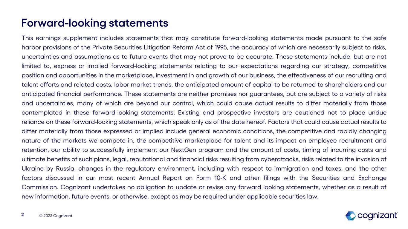© 2023 Cognizant Forward-looking statements This earnings supplement includes statements that may constitute forward-looking statements made pursuant to the safe harbor provisions of the Private Securities Litigation Reform Act of 1995, the accuracy of which are necessarily subject to risks, uncertainties and assumptions as to future events that may not prove to be accurate. These statements include, but are not limited to, express or implied forward-looking statements relating to our expectations regarding our strategy, competitive position and opportunities in the marketplace, investment in and growth of our business, the effectiveness of our recruiting and talent efforts and related costs, labor market trends, the anticipated amount of capital to be returned to shareholders and our anticipated financial performance. These statements are neither promises nor guarantees, but are subject to a variety of risks and uncertainties, many of which are beyond our control, which could cause actual results to differ materially from those contemplated in these forward-looking statements. Existing and prospective investors are cautioned not to place undue reliance on these forward-looking statements, which speak only as of the date hereof. Factors that could cause actual results to differ materially from those expressed or implied include general economic conditions, the competitive and rapidly changing nature of the markets we compete in, the competitive marketplace for talent and its impact on employee recruitment and retention, our ability to successfully implement our NextGen program and the amount of costs, timing of incurring costs and ultimate benefits of such plans, legal, reputational and financial risks resulting from cyberattacks, risks related to the invasion of Ukraine by Russia, changes in the regulatory environment, including with respect to immigration and taxes, and the other factors discussed in our most recent Annual Report on Form 10-K and other filings with the Securities and Exchange Commission. Cognizant undertakes no obligation to update or revise any forward looking statements, whether as a result of new information, future events, or otherwise, except as may be required under applicable securities law. 2