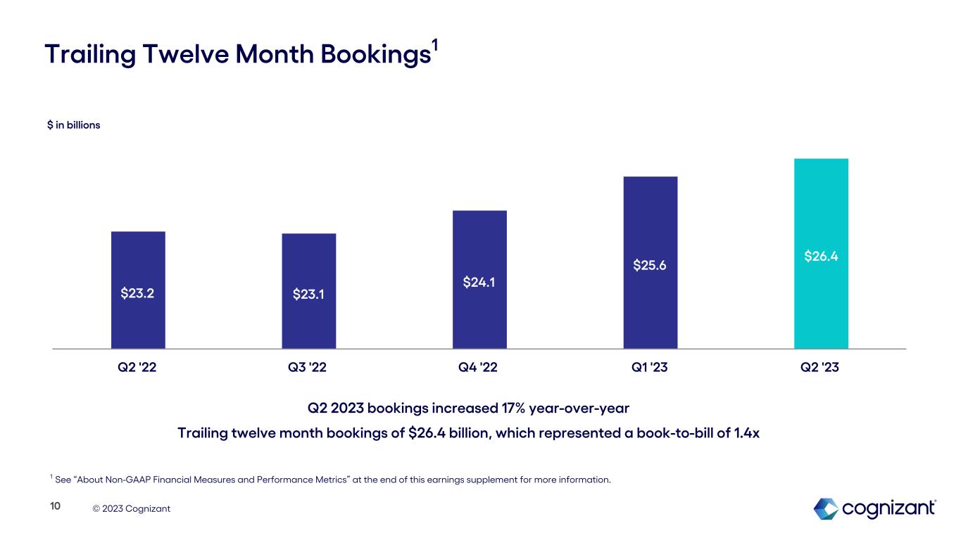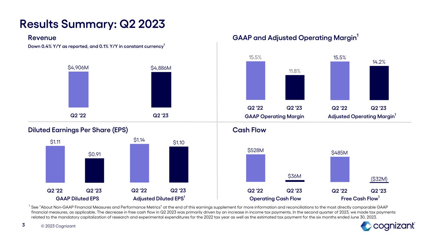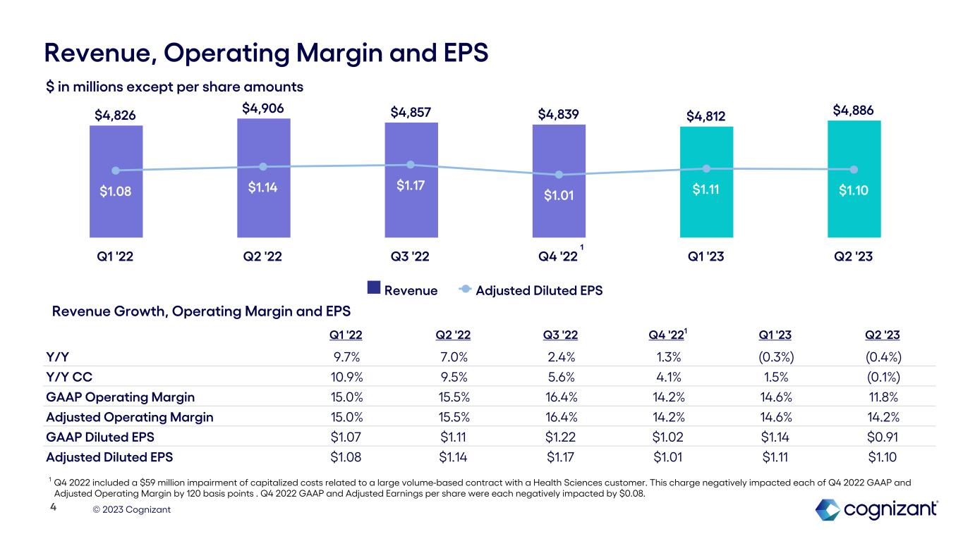 © 2023 Cognizant Results Summary: Q2 2023 1 See “About Non-GAAP Financial Measures and Performance Metrics” at the end of this earnings supplement for more information and reconciliations to the most directly comparable GAAP financial measures, as applicable. The decrease in free cash flow in Q2 2023 was primarily driven by an increase in income tax payments. In the second quarter of 2023, we made tax payments related to the mandatory capitalization of research and experimental expenditures for the 2022 tax year as well as the estimated tax payment for the six months ended June 30, 2023. Revenue Down 0.4% Y/Y as reported, and 0.1% Y/Y in constant currency1 GAAP and Adjusted Operating Margin1 Cash Flow 3 $4,906M $4,886M Q2 '22 Q2 '23 Diluted Earnings Per Share (EPS) 15.5% 11.8% Q2 '22 Q2 '23 15.5% 14.2% Q2 '22 Q2 '23 $528M $36M Q2 '22 Q2 '23 $485M ($32M) Q2 '22 Q2 '23 $1.11 $0.91 Q2 '22 Q2 '23 $1.14 $1.10 Q2 '22 Q2 '23 Adjusted Operating Margin1 GAAP Diluted EPS Adjusted Diluted EPS1 Operating Cash Flow Free Cash Flow1 GAAP Operating Margin Adjusted Operating Margin1