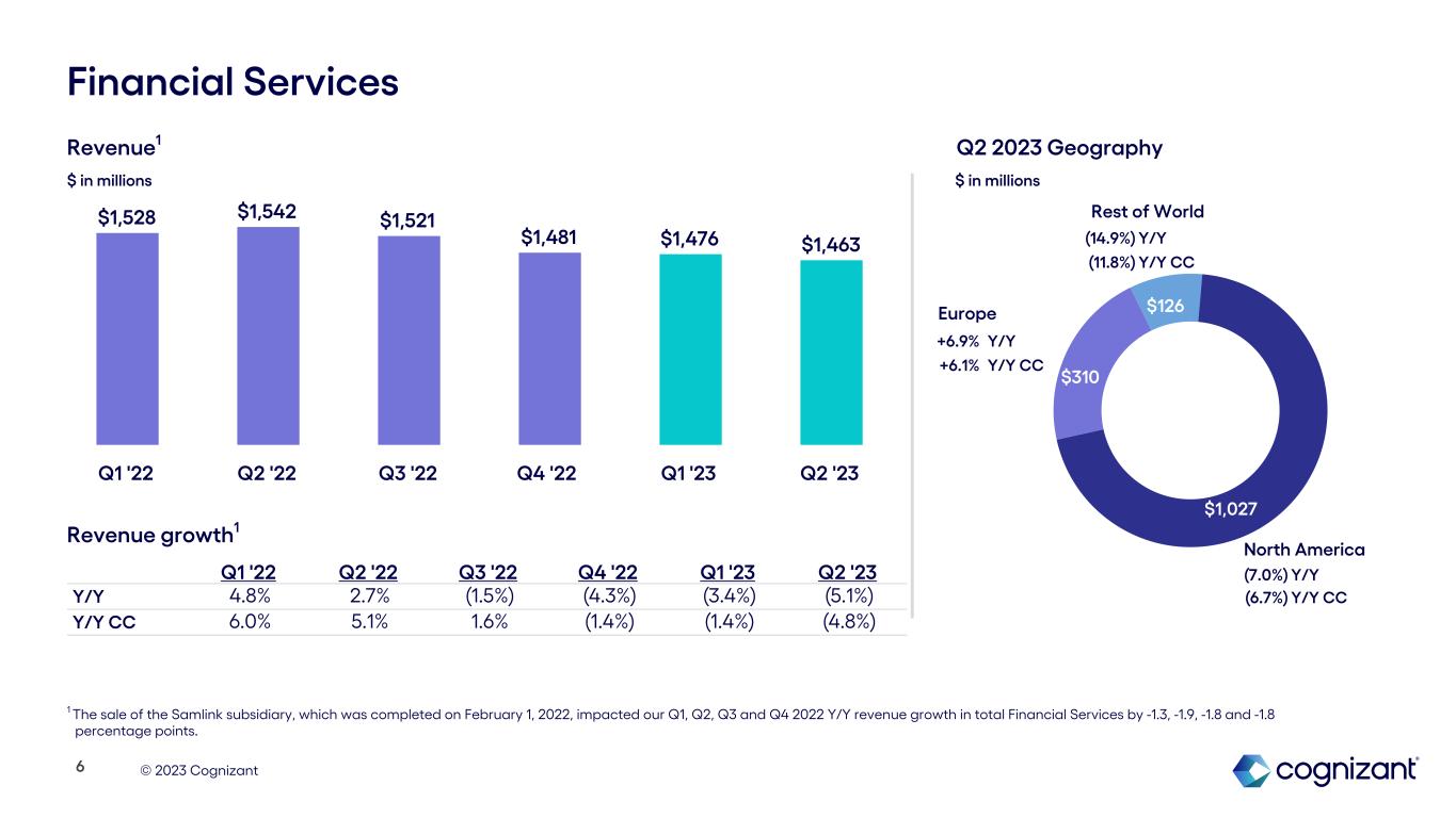 © 2023 Cognizant $1,027 $310 $126 Financial Services North America Europe Rest of World Q1 '22 Q2 '22 Q3 '22 Q4 '22 Q1 '23 Q2 '23 Y/Y 4.8% 2.7% (1.5%) (4.3%) (3.4%) (5.1%) Y/Y CC 6.0% 5.1% 1.6% (1.4%) (1.4%) (4.8%) (14.9%) Y/Y (11.8%) Y/Y CC +6.9% Y/Y +6.1% Y/Y CC Revenue1 Revenue growth1 $ in millions $ in millions Q2 2023 Geography (7.0%) Y/Y (6.7%) Y/Y CC $1,528 $1,542 $1,521 $1,481 $1,476 $1,463 Q1 '22 Q2 '22 Q3 '22 Q4 '22 Q1 '23 Q2 '23 6 1 The sale of the Samlink subsidiary, which was completed on February 1, 2022, impacted our Q1, Q2, Q3 and Q4 2022 Y/Y revenue growth in total Financial Services by -1.3, -1.9, -1.8 and -1.8 percentage points.