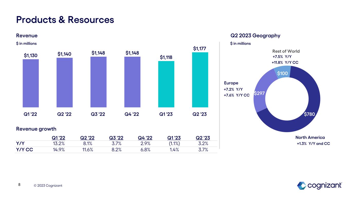 © 2023 Cognizant $1,233 $179 $28 Health Sciences North America Europe Rest of World —% Y/Y +5.1% Y/Y CC +5.3% Y/Y +2.6% Y/Y CC +1.9% Y/Y and CC Revenue $ in millions Q1 '22 Q2 '22 Q3 '22 Q4 '22 Q1 '23 Q2 '23 Y/Y 8.1% 6.3% 3.8% 4.1% 2.9% 2.3% Y/Y CC 8.8% 7.6% 5.5% 5.4% 3.5% 2.1% $1,392 $1,408 $1,405 $1,426 $1,433 $1,440 Q1 '22 Q2 '22 Q3 '22 Q4 '22 Q1 '23 Q2 '23 7 Revenue growth $ in millions Q2 2023 Geography