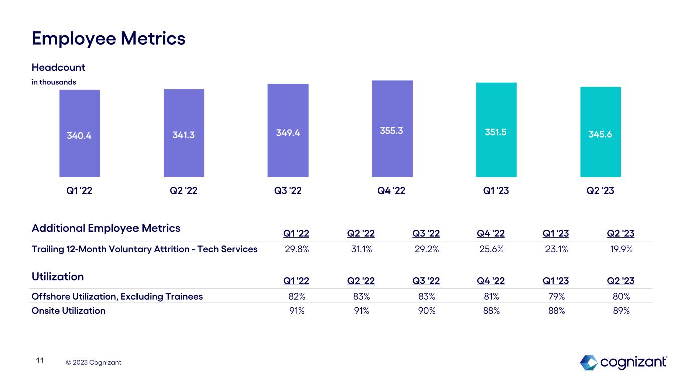 © 2023 Cognizant $23.2 $23.1 $24.1 $25.6 $26.4 Q2 '22 Q3 '22 Q4 '22 Q1 '23 Q2 '23 Trailing Twelve Month Bookings1 10 Q2 2023 bookings increased 17% year-over-year Trailing twelve month bookings of $26.4 billion, which represented a book-to-bill of 1.4x $ in billions 1 See “About Non-GAAP Financial Measures and Performance Metrics” at the end of this earnings supplement for more information.