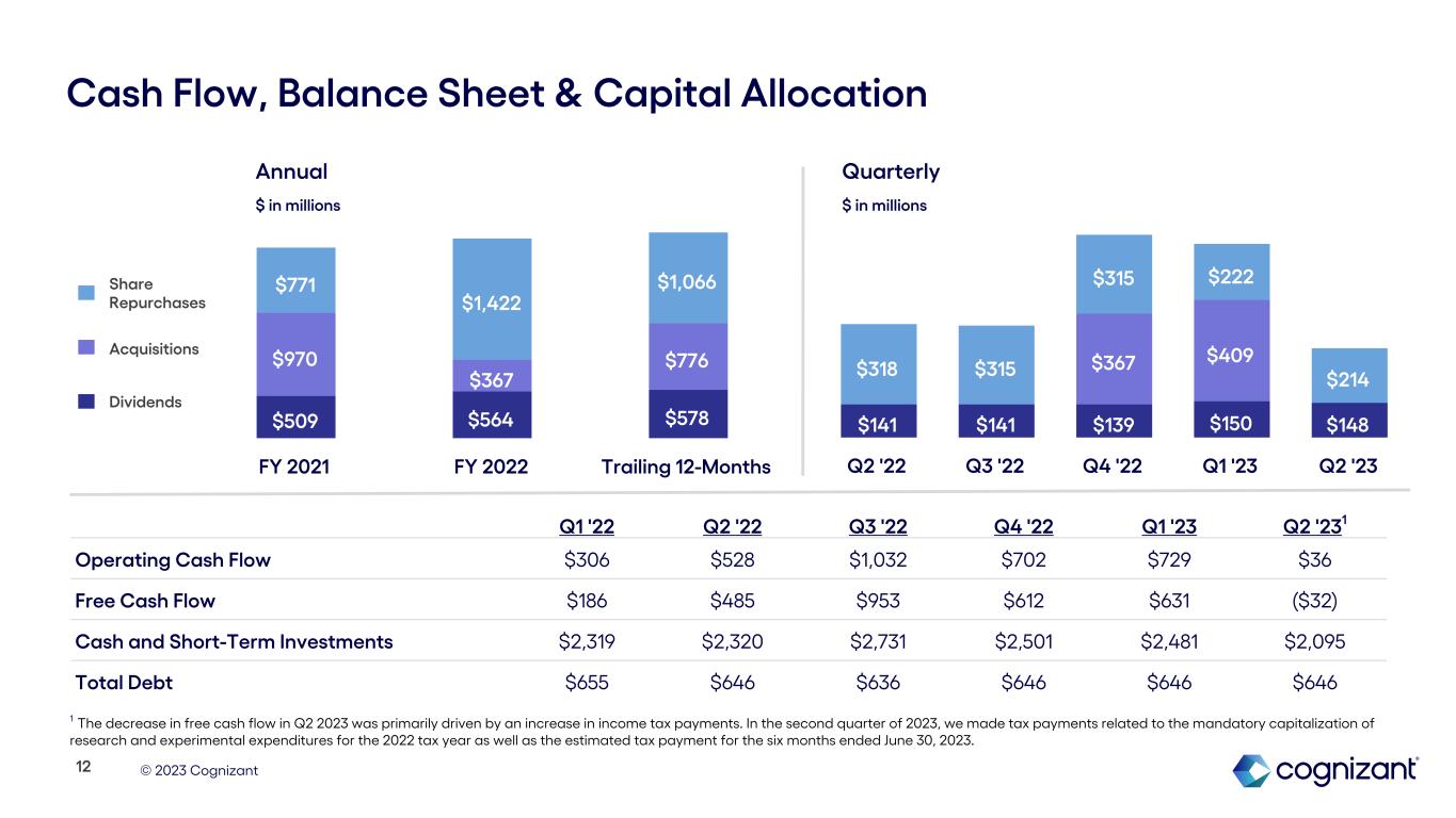 © 2023 Cognizant Employee Metrics 340.4 341.3 349.4 355.3 351.5 345.6 Q1 '22 Q2 '22 Q3 '22 Q4 '22 Q1 '23 Q2 '23 11 Q1 '22 Q2 '22 Q3 '22 Q4 '22 Q1 '23 Q2 '23 Trailing 12-Month Voluntary Attrition - Tech Services 29.8% 31.1% 29.2% 25.6% 23.1% 19.9% Additional Employee Metrics Q1 '22 Q2 '22 Q3 '22 Q4 '22 Q1 '23 Q2 '23 Offshore Utilization, Excluding Trainees 82% 83% 83% 81% 79% 80% Onsite Utilization 91% 91% 90% 88% 88% 89% Utilization Headcount in thousands