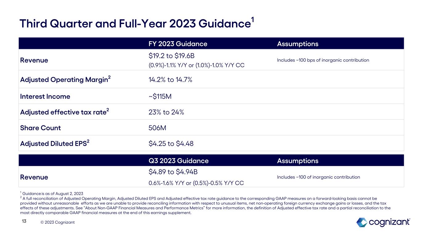 © 2023 Cognizant $509 $564 $578 $970 $367 $776 $771 $1,422 $1,066 FY 2021 FY 2022 Trailing 12-Months Acquisitions Share Repurchases $141 $141 $139 $150 $148 $367 $409$318 $315 $315 $222 $214 Q2 '22 Q3 '22 Q4 '22 Q1 '23 Q2 '23 Cash Flow, Balance Sheet & Capital Allocation Q1 '22 Q2 '22 Q3 '22 Q4 '22 Q1 '23 Q2 '231 Operating Cash Flow $306 $528 $1,032 $702 $729 $36 Free Cash Flow $186 $485 $953 $612 $631 ($32) Cash and Short-Term Investments $2,319 $2,320 $2,731 $2,501 $2,481 $2,095 Total Debt $655 $646 $636 $646 $646 $646 Annual Quarterly Dividends 12 $ in millions $ in millions 1 The decrease in free cash flow in Q2 2023 was primarily driven by an increase in income tax payments. In the second quarter of 2023, we made tax payments related to the mandatory capitalization of research and experimental expenditures for the 2022 tax year as well as the estimated tax payment for the six months ended June 30, 2023.