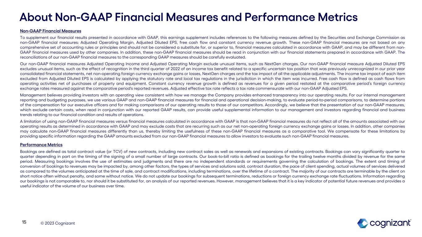 © 2023 Cognizant Non-GAAP Financial Measures To supplement our financial results presented in accordance with GAAP, this earnings supplement includes references to the following measures defined by the Securities and Exchange Commission as non-GAAP financial measures: Adjusted Operating Margin, Adjusted Diluted EPS, free cash flow and constant currency revenue growth. These non-GAAP financial measures are not based on any comprehensive set of accounting rules or principles and should not be considered a substitute for, or superior to, financial measures calculated in accordance with GAAP, and may be different from non- GAAP financial measures used by other companies. In addition, these non-GAAP financial measures should be read in conjunction with our financial statements prepared in accordance with GAAP. The reconciliations of our non-GAAP financial measures to the corresponding GAAP measures should be carefully evaluated. Our non-GAAP financial measures Adjusted Operating Income and Adjusted Operating Margin exclude unusual items, such as NextGen charges. Our non-GAAP financial measure Adjusted Diluted EPS excludes unusual items, such as the effect of recognition in the third quarter of 2022 of an income tax benefit related to a specific uncertain tax position that was previously unrecognized in our prior year consolidated financial statements, net non-operating foreign currency exchange gains or losses, NextGen charges and the tax impact of all the applicable adjustments. The income tax impact of each item excluded from Adjusted Diluted EPS is calculated by applying the statutory rate and local tax regulations in the jurisdiction in which the item was incurred. Free cash flow is defined as cash flows from operating activities net of purchases of property and equipment. Constant currency revenue growth is defined as revenues for a given period restated at the comparative period’s foreign currency exchange rates measured against the comparative period's reported revenues. Adjusted effective tax rate reflects a tax rate commensurate with our non-GAAP Adjusted EPS. Management believes providing investors with an operating view consistent with how we manage the Company provides enhanced transparency into our operating results. For our internal management reporting and budgeting purposes, we use various GAAP and non-GAAP financial measures for financial and operational decision-making, to evaluate period-to-period comparisons, to determine portions of the compensation for our executive officers and for making comparisons of our operating results to those of our competitors. Accordingly, we believe that the presentation of our non-GAAP measures, which exclude certain costs, when read in conjunction with our reported GAAP results, can provide useful supplemental information to our management and investors regarding financial and business trends relating to our financial condition and results of operations. A limitation of using non-GAAP financial measures versus financial measures calculated in accordance with GAAP is that non-GAAP financial measures do not reflect all of the amounts associated with our operating results as determined in accordance with GAAP and may exclude costs that are recurring such as our net non-operating foreign currency exchange gains or losses. In addition, other companies may calculate non-GAAP financial measures differently than us, thereby limiting the usefulness of these non-GAAP financial measures as a comparative tool. We compensate for these limitations by providing specific information regarding the GAAP amounts excluded from our non-GAAP financial measures to allow investors to evaluate such non-GAAP financial measures. Performance Metrics Bookings are defined as total contract value (or TCV) of new contracts, including new contract sales as well as renewals and expansions of existing contracts. Bookings can vary significantly quarter to quarter depending in part on the timing of the signing of a small number of large contracts. Our book-to-bill ratio is defined as bookings for the trailing twelve months divided by revenue for the same period. Measuring bookings involves the use of estimates and judgments and there are no independent standards or requirements governing the calculation of bookings. The extent and timing of conversion of bookings to revenues may be impacted by, among other factors, the types of services and solutions sold, contract duration, the pace of client spending, actual volumes of services delivered as compared to the volumes anticipated at the time of sale, and contract modifications, including terminations, over the lifetime of a contract. The majority of our contracts are terminable by the client on short notice often without penalty, and some without notice. We do not update our bookings for subsequent terminations, reductions or foreign currency exchange rate fluctuations. Information regarding our bookings is not comparable to, nor should it be substituted for, an analysis of our reported revenues. However, management believes that it is a key indicator of potential future revenues and provides a useful indicator of the volume of our business over time. About Non-GAAP Financial Measures and Performance Metrics 15
