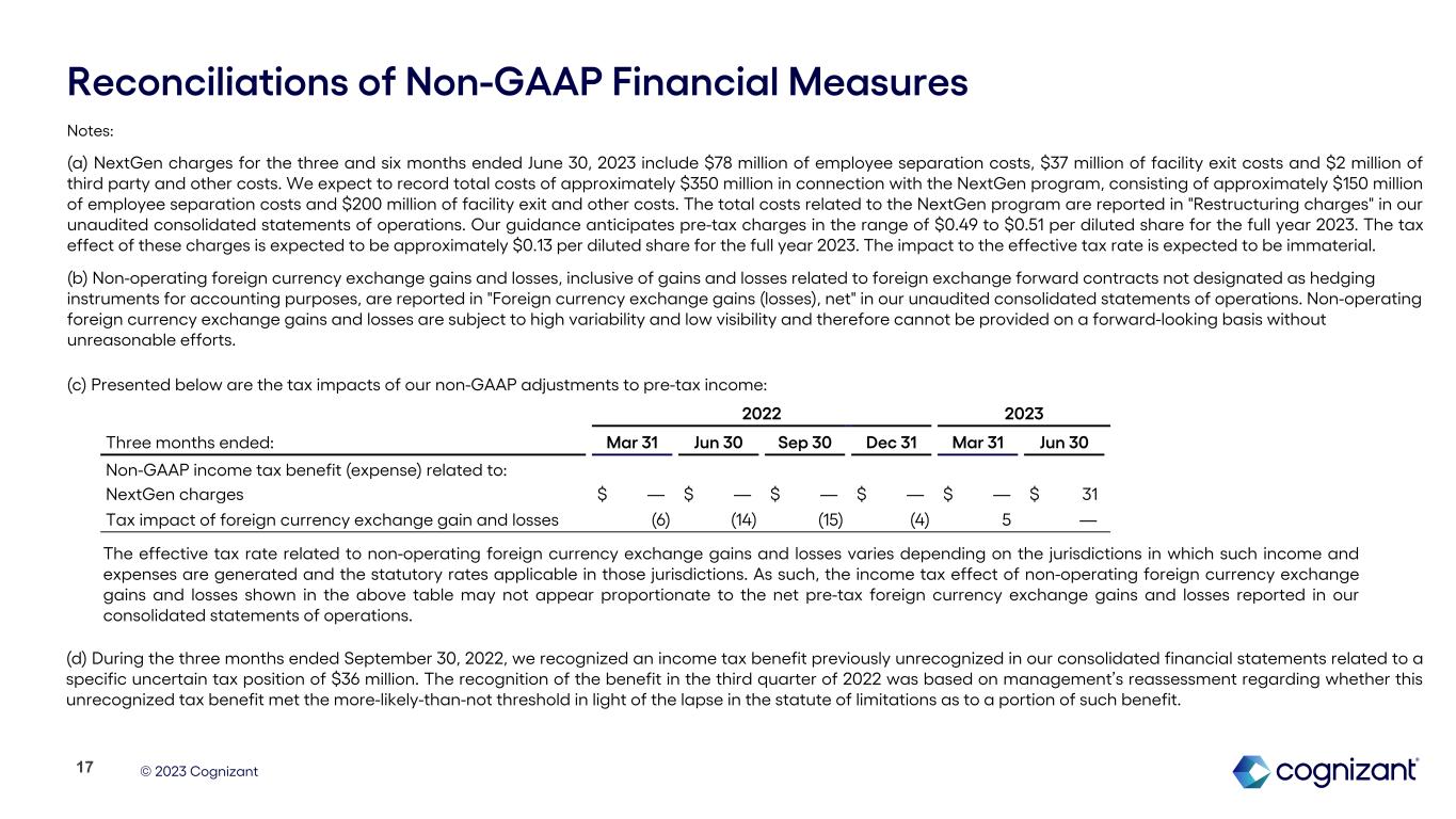 © 2023 Cognizant Reconciliations of Non-GAAP Financial Measures Please refer to page 17 and 18 of this earnings supplement for corresponding Non-GAAP notes. 16 (in millions, except per share amounts) Three Months Ended: Mar 31, 2022 Jun 30, 2022 Sep 30, 2022 Dec 31, 2022 Mar 31, 2023 Jun 30, 2023 Guidance Full Year 2023(1) GAAP income from operations $ 724 $ 760 $ 798 $ 686 $ 702 $ 577 NextGen chargesa) — — — — — 117 Adjusted income from operations $ 724 $ 760 $ 798 $ 686 $ 702 $ 694 GAAP operating margin 15.0 % 15.5 % 16.4 % 14.2 % 14.6 % 11.8 % NextGen charges(a) — — — — — 2.4 1.3% - 1.4% Adjusted operating margin 15.0 % 15.5 % 16.4 % 14.2 % 14.6 % 14.2 % 14.2% - 14.7% GAAP diluted earnings per share $ 1.07 $ 1.11 $ 1.22 $ 1.02 $ 1.14 $ 0.91 Effect of above NextGen charges, pre-tax — — — — — 0.23 (a) Effect of non-operating foreign currency exchange (gains) loss, pre-tax(b) — 0.01 (0.01) (0.02) (0.02) 0.02 (b) Tax effect of above adjustments(c) 0.01 0.02 0.03 0.01 (0.01) (0.06) (a) (b) Effect of recognition of income tax benefit related to an uncertain tax position(d) — — (0.07) — — — — Adjusted diluted earnings per share $ 1.08 $ 1.14 $ 1.17 $ 1.01 $ 1.11 $ 1.10 $4.25 - $4.48 (1) A full reconciliation of Adjusted Operating Margin and Adjusted Diluted Earnings Per Share guidance to the corresponding GAAP measures on a forward-looking basis cannot be provided without unreasonable efforts, as we are unable to provide reconciling information with respect to unusual items, net non-operating foreign currency exchange gains or losses and the tax effects of these adjustments, and such adjustments may be significant.