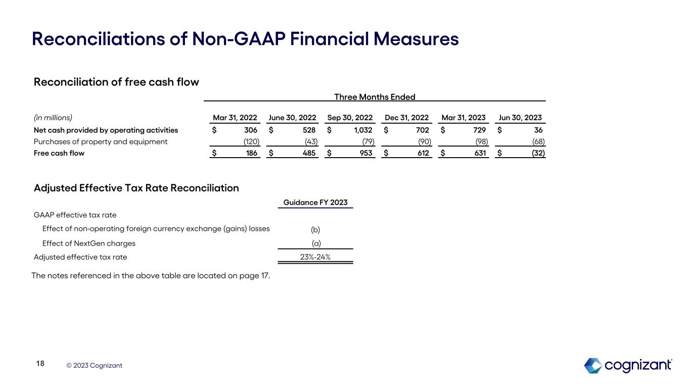 © 2023 Cognizant Reconciliations of Non-GAAP Financial Measures Notes: (a) NextGen charges for the three and six months ended June 30, 2023 include $78 million of employee separation costs, $37 million of facility exit costs and $2 million of third party and other costs. We expect to record total costs of approximately $350 million in connection with the NextGen program, consisting of approximately $150 million of employee separation costs and $200 million of facility exit and other costs. The total costs related to the NextGen program are reported in "Restructuring charges" in our unaudited consolidated statements of operations. Our guidance anticipates pre-tax charges in the range of $0.49 to $0.51 per diluted share for the full year 2023. The tax effect of these charges is expected to be approximately $0.13 per diluted share for the full year 2023. The impact to the effective tax rate is expected to be immaterial. (b) Non-operating foreign currency exchange gains and losses, inclusive of gains and losses related to foreign exchange forward contracts not designated as hedging instruments for accounting purposes, are reported in "Foreign currency exchange gains (losses), net" in our unaudited consolidated statements of operations. Non-operating foreign currency exchange gains and losses are subject to high variability and low visibility and therefore cannot be provided on a forward-looking basis without unreasonable efforts. 17 (d) During the three months ended September 30, 2022, we recognized an income tax benefit previously unrecognized in our consolidated financial statements related to a specific uncertain tax position of $36 million. The recognition of the benefit in the third quarter of 2022 was based on management’s reassessment regarding whether this unrecognized tax benefit met the more-likely-than-not threshold in light of the lapse in the statute of limitations as to a portion of such benefit. 2022 2023 Three months ended: Mar 31 Jun 30 Sep 30 Dec 31 Mar 31 Jun 30 Non-GAAP income tax benefit (expense) related to: NextGen charges $ — $ — $ — $ — $ — $ 31 Tax impact of foreign currency exchange gain and losses (6) (14) (15) (4) 5 — (c) Presented below are the tax impacts of our non-GAAP adjustments to pre-tax income: The effective tax rate related to non-operating foreign currency exchange gains and losses varies depending on the jurisdictions in which such income and expenses are generated and the statutory rates applicable in those jurisdictions. As such, the income tax effect of non-operating foreign currency exchange gains and losses shown in the above table may not appear proportionate to the net pre-tax foreign currency exchange gains and losses reported in our consolidated statements of operations.