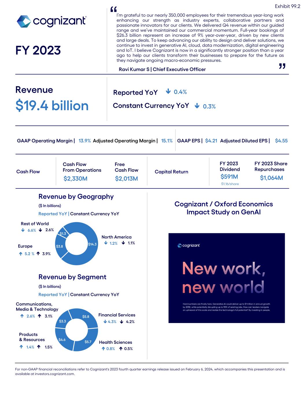 I’m grateful to our nearly 350,000 employees for their tremendous year-long work enhancing our strength as industry experts, collaborative partners and passionate innovators for our clients. We delivered Q4 revenue within our guided range and we’ve maintained our commercial momentum. Full-year bookings of $26.3 billion represent an increase of 9% year-over-year, driven by new clients and large deals. To keep advancing our ability to design and deliver solutions, we continue to invest in generative AI, cloud, data modernization, digital engineering and IoT. I believe Cognizant is now in a significantly stronger position than a year ago to help our clients transform their businesses to prepare for the future as they navigate ongoing macro-economic pressures. FY 2023 Ravi Kumar S | Chief Executive Officer ” Revenue $19.4 billion Reported YoY ê 0.4% Constant Currency YoY ê 0.3% GAAP Operating Margin | 13.9% GAAP EPS | $4.21 $14.3$3.8 $1.3 Rest of World 6.6% Revenue by Geography ($ In billions) Reported YoY | Constant Currency YoY Cash Flow Cash Flow From Operations $2,330M Free Cash Flow $2,013M Capital Return FY 2023 Dividend $591M FY 2023 Share Repurchases $1,064M $1.16/share Revenue by Segment ($ In billions) Reported YoY | Constant Currency YoY Europe North America 2.6% $5.8 $5.7$4.6 $3.3 Products & Resources Health Sciences Financial Services Communications, Media & Technology 5.2 % 3.9% 1.2% 1.1% 2.6% 3.1% 1.4% 1.5% 4.3% 4.2% 0.8% 0.5% ” For non-GAAP financial reconciliations refer to Cognizant's 2023 fourth quarter earnings release issued on February 6, 2024, which accompanies this presentation and is available at investors.cognizant.com. é é é é é é é é é é é é é é Adjusted Diluted EPS | $4.55 Cognizant / Oxford Economics Impact Study on GenAI Adjusted Operating Margin | 15.1% Exhibit 99.2