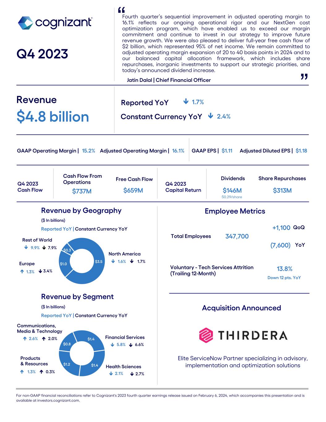 Fourth quarter’s sequential improvement in adjusted operating margin to 16.1% reflects our ongoing operational rigor and our NextGen cost optimization program, which have enabled us to exceed our margin commitment and continue to invest in our strategy to improve future revenue growth. We were also pleased to deliver full-year free cash flow of $2 billion, which represented 95% of net income. We remain committed to adjusted operating margin expansion of 20 to 40 basis points in 2024 and to our balanced capital allocation framework, which includes share repurchases, inorganic investments to support our strategic priorities, and today’s announced dividend increase. Q4 2023 Jatin Dalal | Chief Financial Officer ” Revenue $4.8 billion Reported YoY ê 1.7% Constant Currency YoY ê 2.4% GAAP Operating Margin | 15.2% GAAP EPS | $1.11 $3.5$1.0 $0.3 Rest of World 9.9% Revenue by Geography ($ In billions) Reported YoY | Constant Currency YoY Q4 2023 Cash Flow Cash Flow From Operations $737M Free Cash Flow $659M Q4 2023 Capital Return Dividends $146M Share Repurchases $313M $0.29/share Revenue by Segment ($ In billions) Reported YoY | Constant Currency YoY Europe North America 7.9% $1.4 $1.4$1.2 $0.8 Products & Resources Health Sciences Financial Services Communications, Media & Technology 1.3% 3.4% 1.6% 1.7% 2.6% 2.0% 1.3% 0.3% 5.8% 6.6% 2.1% 2.7% Total Employees 347,700 ” For non-GAAP financial reconciliations refer to Cognizant's 2023 fourth quarter earnings release issued on February 6, 2024, which accompanies this presentation and is available at investors.cognizant.com. +1,100 QoQ (7,600) YoY Voluntary - Tech Services Attrition (Trailing 12-Month) 13.8% é é é é é é é é é é é Adjusted Diluted EPS | $1.18 Employee Metrics Down 12 pts. YoY Adjusted Operating Margin | 16.1% é é é é Acquisition Announced Elite ServiceNow Partner specializing in advisory, implementation and optimization solutions