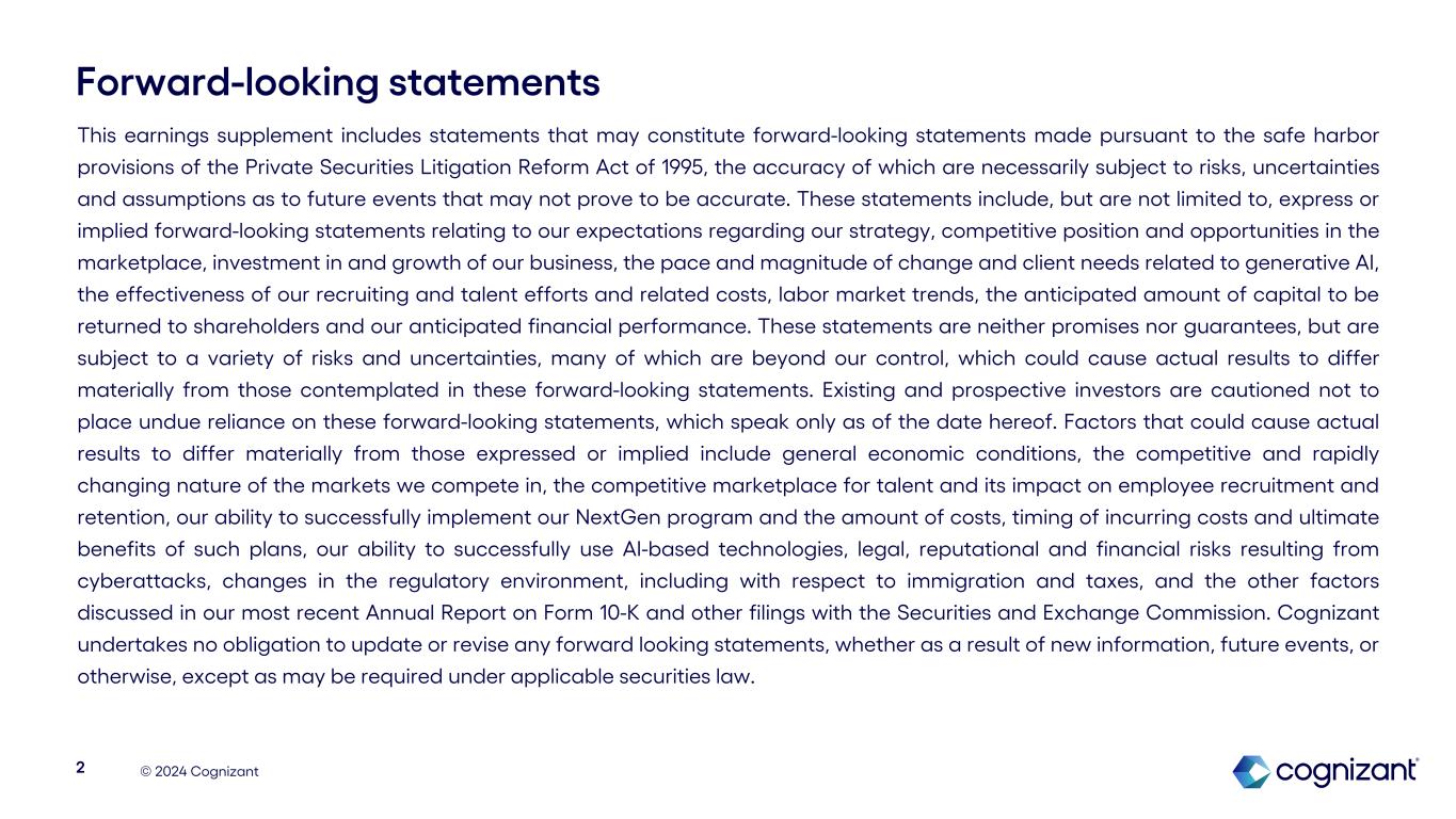 © 2024 Cognizant Forward-looking statements This earnings supplement includes statements that may constitute forward-looking statements made pursuant to the safe harbor provisions of the Private Securities Litigation Reform Act of 1995, the accuracy of which are necessarily subject to risks, uncertainties and assumptions as to future events that may not prove to be accurate. These statements include, but are not limited to, express or implied forward-looking statements relating to our expectations regarding our strategy, competitive position and opportunities in the marketplace, investment in and growth of our business, the pace and magnitude of change and client needs related to generative AI, the effectiveness of our recruiting and talent efforts and related costs, labor market trends, the anticipated amount of capital to be returned to shareholders and our anticipated financial performance. These statements are neither promises nor guarantees, but are subject to a variety of risks and uncertainties, many of which are beyond our control, which could cause actual results to differ materially from those contemplated in these forward-looking statements. Existing and prospective investors are cautioned not to place undue reliance on these forward-looking statements, which speak only as of the date hereof. Factors that could cause actual results to differ materially from those expressed or implied include general economic conditions, the competitive and rapidly changing nature of the markets we compete in, the competitive marketplace for talent and its impact on employee recruitment and retention, our ability to successfully implement our NextGen program and the amount of costs, timing of incurring costs and ultimate benefits of such plans, our ability to successfully use AI-based technologies, legal, reputational and financial risks resulting from cyberattacks, changes in the regulatory environment, including with respect to immigration and taxes, and the other factors discussed in our most recent Annual Report on Form 10-K and other filings with the Securities and Exchange Commission. Cognizant undertakes no obligation to update or revise any forward looking statements, whether as a result of new information, future events, or otherwise, except as may be required under applicable securities law. 2
