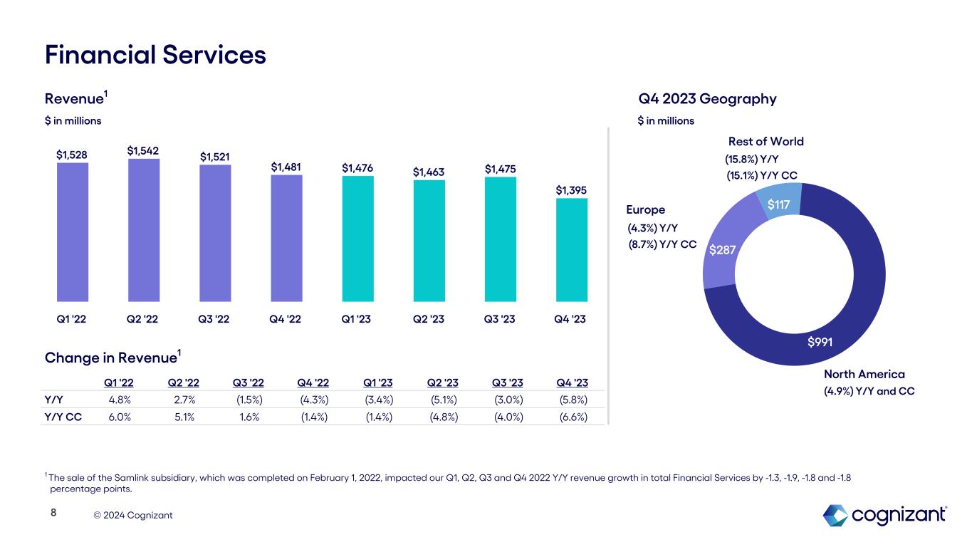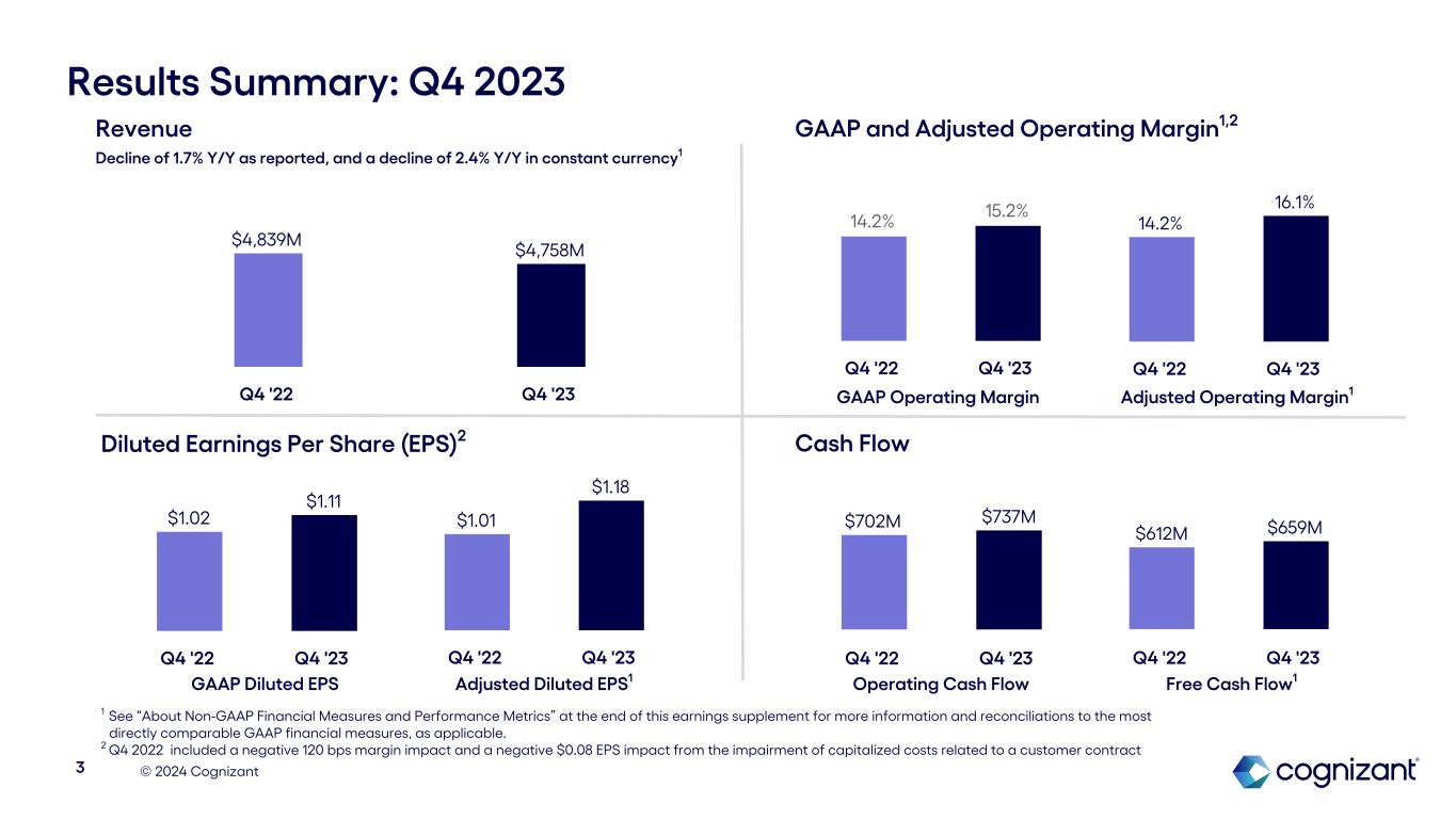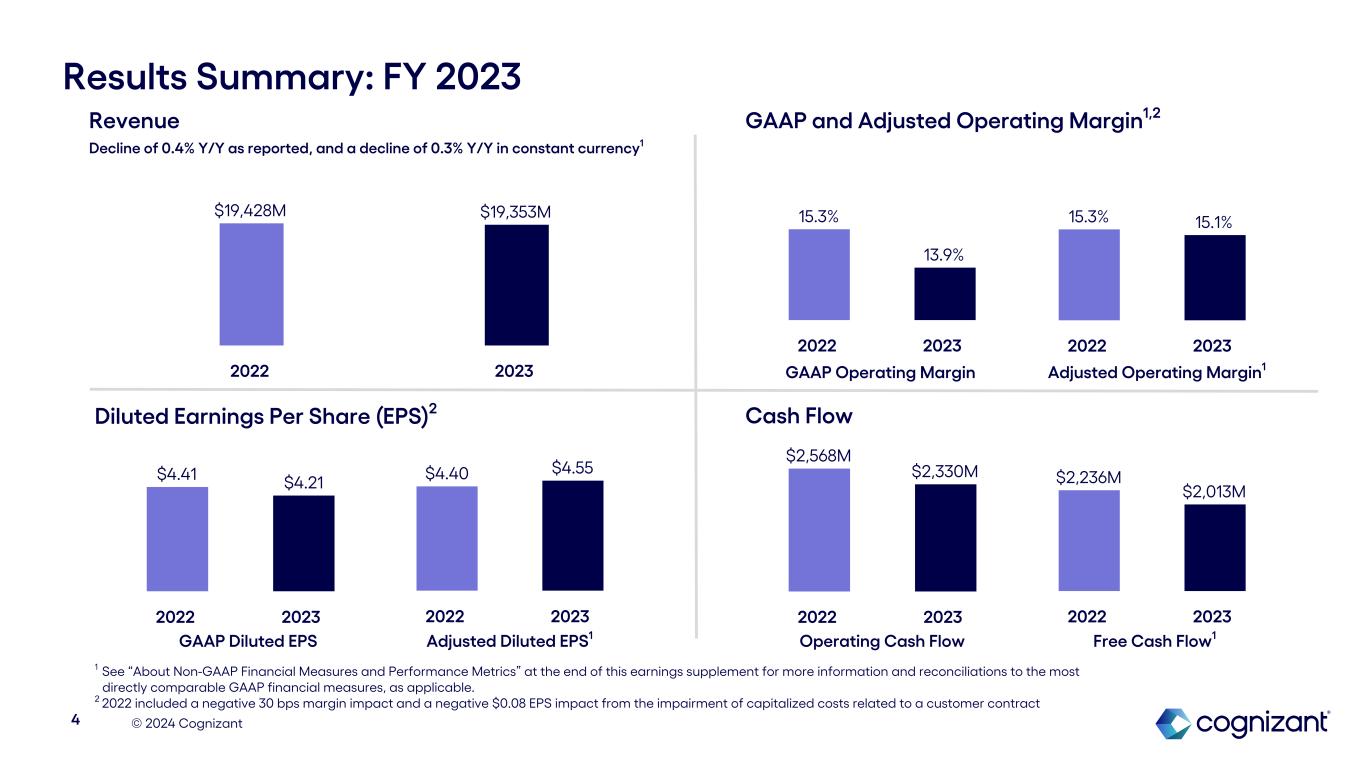 © 2024 Cognizant $702M $737M Q4 '22 Q4 '23 Results Summary: Q4 2023 1 See “About Non-GAAP Financial Measures and Performance Metrics” at the end of this earnings supplement for more information and reconciliations to the most directly comparable GAAP financial measures, as applicable. 2 Q4 2022 included a negative 120 bps margin impact and a negative $0.08 EPS impact from the impairment of capitalized costs related to a customer contract Revenue Decline of 1.7% Y/Y as reported, and a decline of 2.4% Y/Y in constant currency1 GAAP and Adjusted Operating Margin1,2 Cash Flow 3 $4,839M $4,758M Q4 '22 Q4 '23 14.2% 15.2% Q4 '22 Q4 '23 14.2% 16.1% Q4 '22 Q4 '23 $612M $659M Q4 '22 Q4 '23 $1.02 $1.11 Q4 '22 Q4 '23 $1.01 $1.18 Q4 '22 Q4 '23 Adjusted Operating Margin1 GAAP Diluted EPS Adjusted Diluted EPS1 Operating Cash Flow Free Cash Flow1 GAAP Operating Margin Adjusted Operating Margin1 Diluted Earnings Per Share (EPS)2
