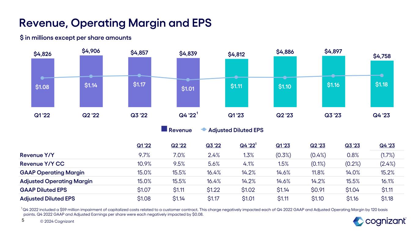 © 2024 Cognizant Results Summary: FY 2023 Revenue Decline of 0.4% Y/Y as reported, and a decline of 0.3% Y/Y in constant currency1 GAAP and Adjusted Operating Margin1,2 4 $19,428M $19,353M 2022 2023 15.3% 13.9% 2022 2023 15.3% 15.1% 2022 2023 $2,568M $2,330M 2022 2023 $2,236M $2,013M 2022 2023 $4.41 $4.21 2022 2023 $4.40 $4.55 2022 2023 Adjusted Operating Margin1 GAAP Diluted EPS Adjusted Diluted EPS1 Operating Cash Flow Free Cash Flow1 GAAP Operating Margin Adjusted Operating Margin1 1 See “About Non-GAAP Financial Measures and Performance Metrics” at the end of this earnings supplement for more information and reconciliations to the most directly comparable GAAP financial measures, as applicable. 2 2022 included a negative 30 bps margin impact and a negative $0.08 EPS impact from the impairment of capitalized costs related to a customer contract Diluted Earnings Per Share (EPS)2 Cash Flow