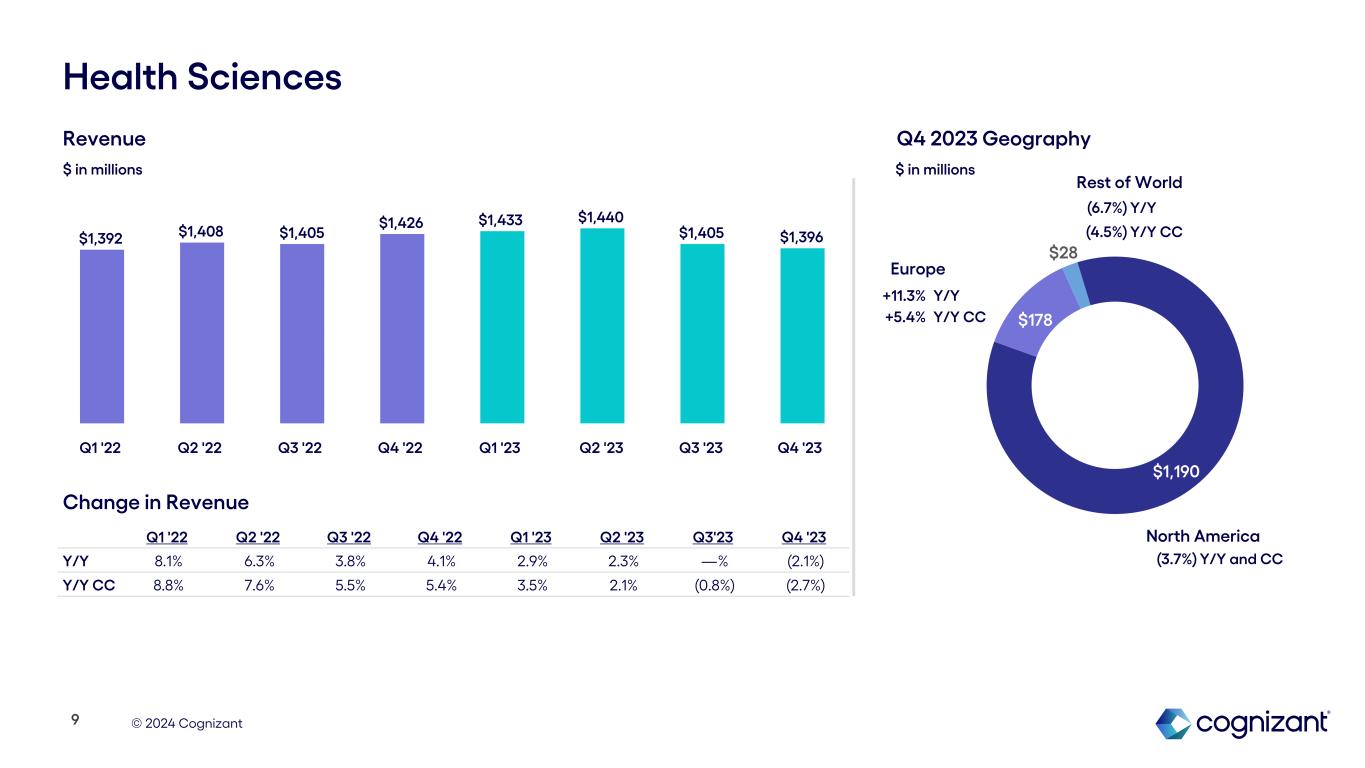 © 2024 Cognizant $991 $287 $117 Financial Services North America Europe Rest of World Q1 '22 Q2 '22 Q3 '22 Q4 '22 Q1 '23 Q2 '23 Q3 '23 Q4 '23 Y/Y 4.8% 2.7% (1.5%) (4.3%) (3.4%) (5.1%) (3.0%) (5.8%) Y/Y CC 6.0% 5.1% 1.6% (1.4%) (1.4%) (4.8%) (4.0%) (6.6%) (15.8%) Y/Y (15.1%) Y/Y CC (4.3%) Y/Y (8.7%) Y/Y CC Revenue1 Change in Revenue1 $ in millions $ in millions Q4 2023 Geography (4.9%) Y/Y and CC $1,528 $1,542 $1,521 $1,481 $1,476 $1,463 $1,475 $1,395 Q1 '22 Q2 '22 Q3 '22 Q4 '22 Q1 '23 Q2 '23 Q3 '23 Q4 '23 8 1 The sale of the Samlink subsidiary, which was completed on February 1, 2022, impacted our Q1, Q2, Q3 and Q4 2022 Y/Y revenue growth in total Financial Services by -1.3, -1.9, -1.8 and -1.8 percentage points.
