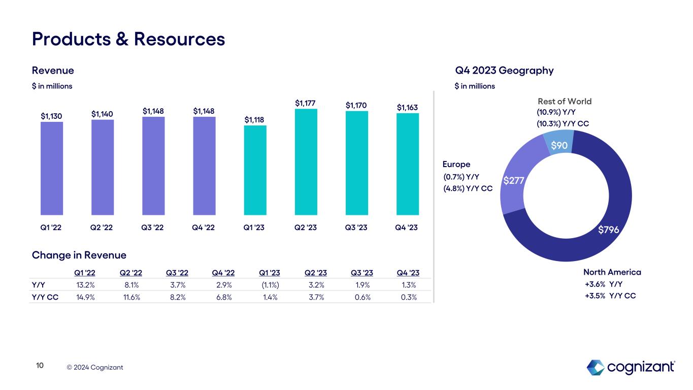 © 2024 Cognizant $1,190 $178 $28 Health Sciences North America Europe Rest of World (6.7%) Y/Y (4.5%) Y/Y CC +11.3% Y/Y +5.4% Y/Y CC (3.7%) Y/Y and CC Revenue $ in millions Q1 '22 Q2 '22 Q3 '22 Q4 '22 Q1 '23 Q2 '23 Q3'23 Q4 '23 Y/Y 8.1% 6.3% 3.8% 4.1% 2.9% 2.3% —% (2.1%) Y/Y CC 8.8% 7.6% 5.5% 5.4% 3.5% 2.1% (0.8%) (2.7%) $1,392 $1,408 $1,405 $1,426 $1,433 $1,440 $1,405 $1,396 Q1 '22 Q2 '22 Q3 '22 Q4 '22 Q1 '23 Q2 '23 Q3 '23 Q4 '23 9 Change in Revenue $ in millions Q4 2023 Geography