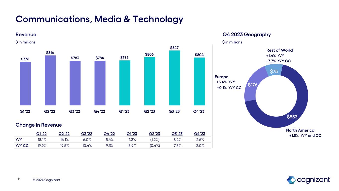 © 2024 Cognizant $796 $277 $90 North America Europe Products & Resources +3.6% Y/Y +3.5% Y/Y CC (0.7%) Y/Y (4.8%) Y/Y CC (10.9%) Y/Y (10.3%) Y/Y CC Rest of World Revenue $ in millions Q1 '22 Q2 '22 Q3 '22 Q4 '22 Q1 '23 Q2 '23 Q3 '23 Q4 '23 Y/Y 13.2% 8.1% 3.7% 2.9% (1.1%) 3.2% 1.9% 1.3% Y/Y CC 14.9% 11.6% 8.2% 6.8% 1.4% 3.7% 0.6% 0.3% $1,130 $1,140 $1,148 $1,148 $1,118 $1,177 $1,170 $1,163 Q1 '22 Q2 '22 Q3 '22 Q4 '22 Q1 '23 Q2 '23 Q3 '23 Q4 '23 10 Change in Revenue $ in millions Q4 2023 Geography