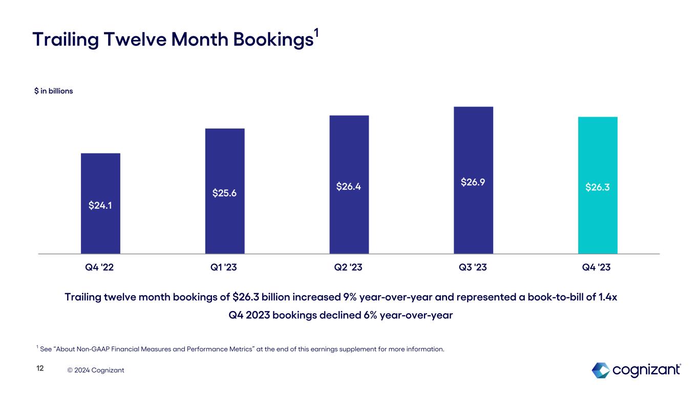 © 2024 Cognizant $24.1 $25.6 $26.4 $26.9 $26.3 Q4 '22 Q1 '23 Q2 '23 Q3 '23 Q4 '23 Trailing Twelve Month Bookings1 12 Trailing twelve month bookings of $26.3 billion increased 9% year-over-year and represented a book-to-bill of 1.4x Q4 2023 bookings declined 6% year-over-year $ in billions 1 See “About Non-GAAP Financial Measures and Performance Metrics” at the end of this earnings supplement for more information.