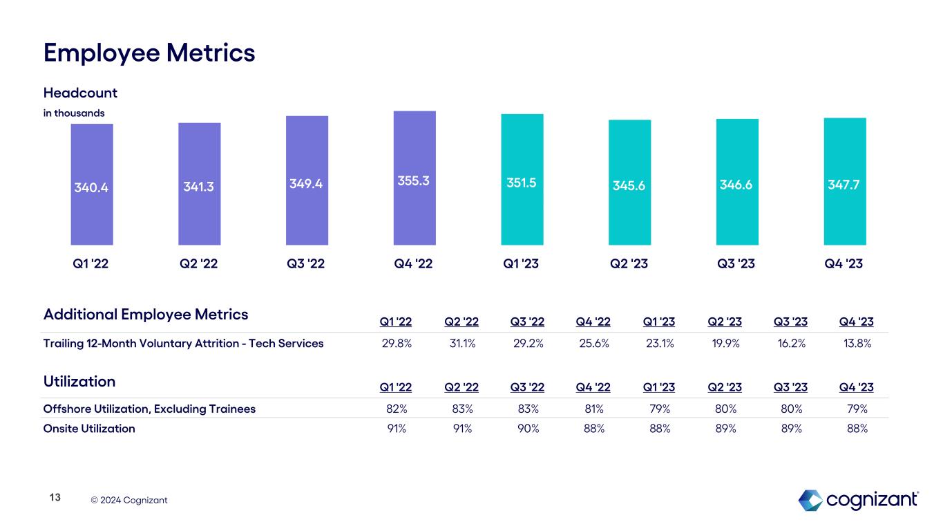 © 2024 Cognizant $3,530 $918 $310 $1,395 $1,396 $1,163 $804 Revenue Performance: Q4 2023 Products & Resources Communications, Media & Technology Health Sciences Financial Services North America Europe Rest of World Segments $ in millions Geography $ in millions +2.6% Y/Y +2.0% Y/Y CC +1.3% Y/Y +0.3% Y/Y CC (2.1%) Y/Y (2.7%) Y/Y CC (5.8%) Y/Y (6.6%) Y/Y CC +1.3% Y/Y (3.4%) Y/Y CC (9.9%) Y/Y (7.9%) Y/Y CC (1.6%) Y/Y (1.7%) Y/Y CC 6