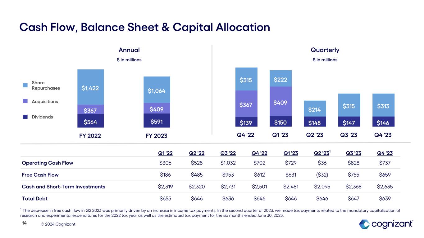 © 2024 Cognizant $564 $591 $367 $409 $1,422 $1,064 FY 2022 FY 2023 Acquisitions Share Repurchases $139 $150 $148 $147 $146 $367 $409 $315 $222 $214 $315 $313 Q4 '22 Q1 '23 Q2 '23 Q3 '23 Q4 '23 Cash Flow, Balance Sheet & Capital Allocation Q1 '22 Q2 '22 Q3 '22 Q4 '22 Q1 '23 Q2 '231 Q3 '23 Q4 '23 Operating Cash Flow $306 $528 $1,032 $702 $729 $36 $828 $737 Free Cash Flow $186 $485 $953 $612 $631 ($32) $755 $659 Cash and Short-Term Investments $2,319 $2,320 $2,731 $2,501 $2,481 $2,095 $2,368 $2,635 Total Debt $655 $646 $636 $646 $646 $646 $647 $639 Annual Quarterly Dividends 14 $ in millions $ in millions 1 The decrease in free cash flow in Q2 2023 was primarily driven by an increase in income tax payments. In the second quarter of 2023, we made tax payments related to the mandatory capitalization of research and experimental expenditures for the 2022 tax year as well as the estimated tax payment for the six months ended June 30, 2023.