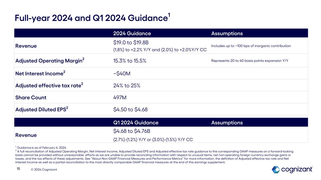 © 2024 Cognizant Full-year 2024 and Q1 2024 Guidance1 1 Guidance is as of February 6, 2024 2 A full reconciliation of Adjusted Operating Margin, Net Interest Income, Adjusted Diluted EPS and Adjusted effective tax rate guidance to the corresponding GAAP measures on a forward-looking basis cannot be provided without unreasonable efforts as we are unable to provide reconciling information with respect to unusual items, net non-operating foreign currency exchange gains or losses, and the tax effects of these adjustments. See “About Non-GAAP Financial Measures and Performance Metrics” for more information, the definition of Adjusted effective tax rate and Net Interest Income as well as a partial reconciliation to the most directly comparable GAAP financial measures at the end of this earnings supplement. Q1 2024 Guidance Assumptions Revenue $4.68 to $4.76B (2.7%)-(1.2%) Y/Y or (3.0%)-(1.5%) Y/Y CC 15 2024 Guidance Assumptions Revenue $19.0 to $19.8B (1.8%) to +2.2% Y/Y and (2.0%) to +2.0%Y/Y CC Includes up to ~100 bps of inorganic contribution Adjusted Operating Margin2 15.3% to 15.5% Represents 20 to 40 basis points expansion Y/Y Net Interest Income2 ~$40M Adjusted effective tax rate2 24% to 25% Share Count 497M Adjusted Diluted EPS2 $4.50 to $4.68