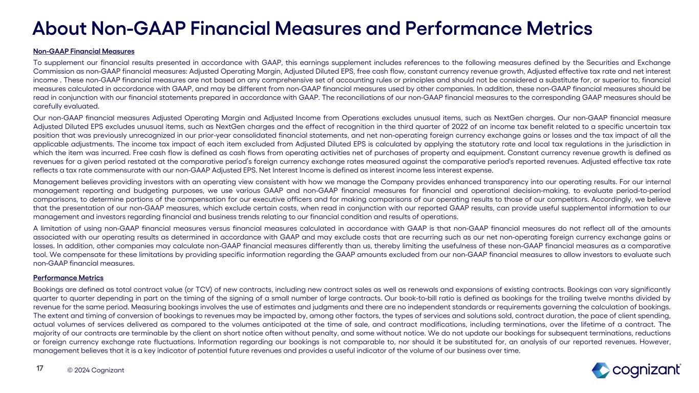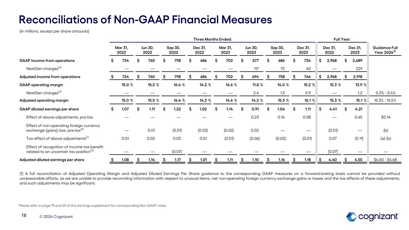 © 2024 Cognizant Non-GAAP Financial Measures To supplement our financial results presented in accordance with GAAP, this earnings supplement includes references to the following measures defined by the Securities and Exchange Commission as non-GAAP financial measures: Adjusted Operating Margin, Adjusted Diluted EPS, free cash flow, constant currency revenue growth, Adjusted effective tax rate and net interest income . These non-GAAP financial measures are not based on any comprehensive set of accounting rules or principles and should not be considered a substitute for, or superior to, financial measures calculated in accordance with GAAP, and may be different from non-GAAP financial measures used by other companies. In addition, these non-GAAP financial measures should be read in conjunction with our financial statements prepared in accordance with GAAP. The reconciliations of our non-GAAP financial measures to the corresponding GAAP measures should be carefully evaluated. Our non-GAAP financial measures Adjusted Operating Margin and Adjusted Income from Operations excludes unusual items, such as NextGen charges. Our non-GAAP financial measure Adjusted Diluted EPS excludes unusual items, such as NextGen charges and the effect of recognition in the third quarter of 2022 of an income tax benefit related to a specific uncertain tax position that was previously unrecognized in our prior-year consolidated financial statements, and net non-operating foreign currency exchange gains or losses and the tax impact of all the applicable adjustments. The income tax impact of each item excluded from Adjusted Diluted EPS is calculated by applying the statutory rate and local tax regulations in the jurisdiction in which the item was incurred. Free cash flow is defined as cash flows from operating activities net of purchases of property and equipment. Constant currency revenue growth is defined as revenues for a given period restated at the comparative period’s foreign currency exchange rates measured against the comparative period's reported revenues. Adjusted effective tax rate reflects a tax rate commensurate with our non-GAAP Adjusted EPS. Net Interest Income is defined as interest income less interest expense. Management believes providing investors with an operating view consistent with how we manage the Company provides enhanced transparency into our operating results. For our internal management reporting and budgeting purposes, we use various GAAP and non-GAAP financial measures for financial and operational decision-making, to evaluate period-to-period comparisons, to determine portions of the compensation for our executive officers and for making comparisons of our operating results to those of our competitors. Accordingly, we believe that the presentation of our non-GAAP measures, which exclude certain costs, when read in conjunction with our reported GAAP results, can provide useful supplemental information to our management and investors regarding financial and business trends relating to our financial condition and results of operations. A limitation of using non-GAAP financial measures versus financial measures calculated in accordance with GAAP is that non-GAAP financial measures do not reflect all of the amounts associated with our operating results as determined in accordance with GAAP and may exclude costs that are recurring such as our net non-operating foreign currency exchange gains or losses. In addition, other companies may calculate non-GAAP financial measures differently than us, thereby limiting the usefulness of these non-GAAP financial measures as a comparative tool. We compensate for these limitations by providing specific information regarding the GAAP amounts excluded from our non-GAAP financial measures to allow investors to evaluate such non-GAAP financial measures. Performance Metrics Bookings are defined as total contract value (or TCV) of new contracts, including new contract sales as well as renewals and expansions of existing contracts. Bookings can vary significantly quarter to quarter depending in part on the timing of the signing of a small number of large contracts. Our book-to-bill ratio is defined as bookings for the trailing twelve months divided by revenue for the same period. Measuring bookings involves the use of estimates and judgments and there are no independent standards or requirements governing the calculation of bookings. The extent and timing of conversion of bookings to revenues may be impacted by, among other factors, the types of services and solutions sold, contract duration, the pace of client spending, actual volumes of services delivered as compared to the volumes anticipated at the time of sale, and contract modifications, including terminations, over the lifetime of a contract. The majority of our contracts are terminable by the client on short notice often without penalty, and some without notice. We do not update our bookings for subsequent terminations, reductions or foreign currency exchange rate fluctuations. Information regarding our bookings is not comparable to, nor should it be substituted for, an analysis of our reported revenues. However, management believes that it is a key indicator of potential future revenues and provides a useful indicator of the volume of our business over time. About Non-GAAP Financial Measures and Performance Metrics 17
