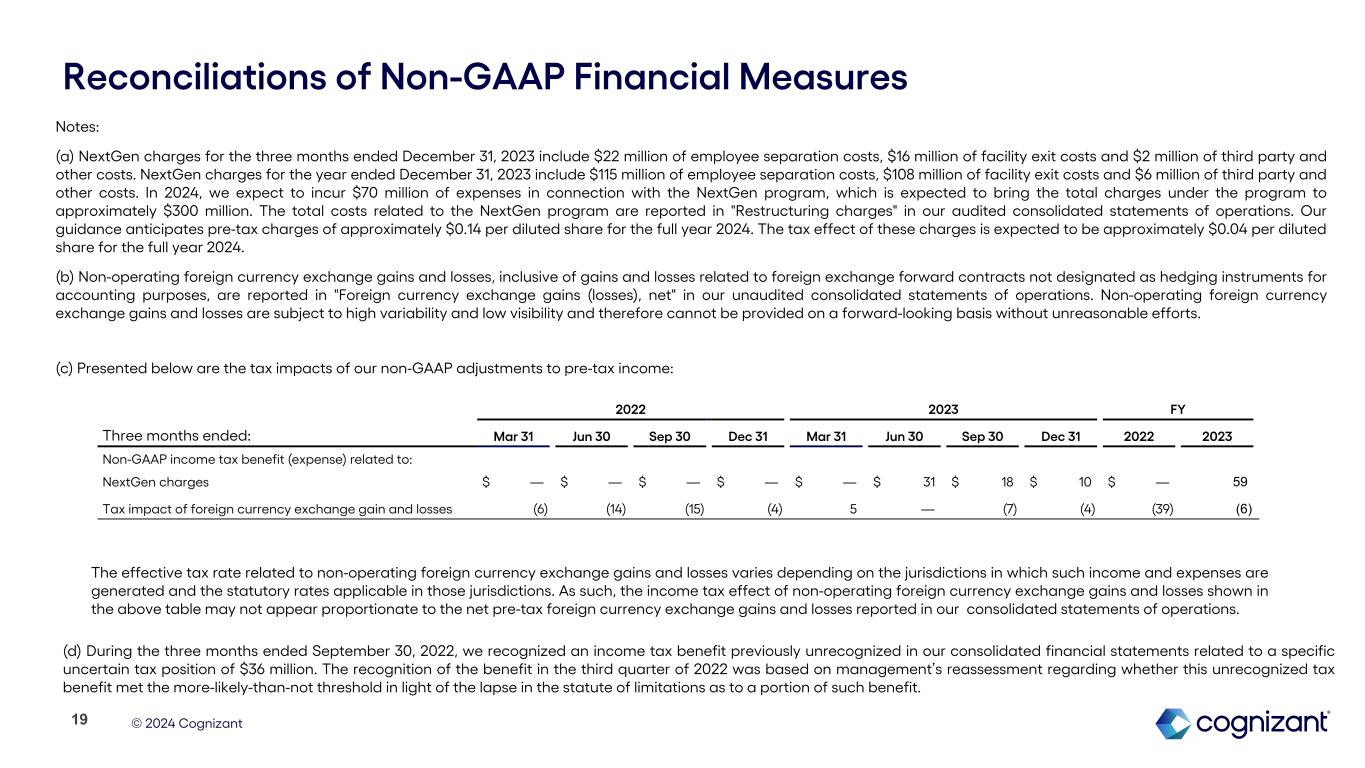 © 2024 Cognizant Reconciliations of Non-GAAP Financial Measures Please refer to page 19 and 20 of this earnings supplement for corresponding Non-GAAP notes. 18 (in millions, except per share amounts) Three Months Ended: Full Year: Mar 31, 2022 Jun 30, 2022 Sep 30, 2022 Dec 31, 2022 Mar 31, 2023 Jun 30, 2023 Sep 30, 2023 Dec 31, 2023 Dec 31, 2022 Dec 31, 2023 Guidance Full Year 2024(1) GAAP income from operations $ 724 $ 760 $ 798 $ 686 $ 702 $ 577 $ 686 $ 724 $ 2,968 $ 2,689 NextGen charges(a) — — — — — 117 72 40 — 229 Adjusted income from operations $ 724 $ 760 $ 798 $ 686 $ 702 $ 694 $ 758 $ 764 $ 2,968 $ 2,918 GAAP operating margin 15.0 % 15.5 % 16.4 % 14.2 % 14.6 % 11.8 % 14.0 % 15.2 % 15.3 % 13.9 % NextGen charges(a) — — — — — 2.4 1.5 0.9 — 1.2 0.3% - 0.4% Adjusted operating margin 15.0 % 15.5 % 16.4 % 14.2 % 14.6 % 14.2 % 15.5 % 16.1 % 15.3 % 15.1 % 15.3% - 15.5% GAAP diluted earnings per share $ 1.07 $ 1.11 $ 1.22 $ 1.02 $ 1.14 $ 0.91 $ 1.04 $ 1.11 $ 4.41 $ 4.21 Effect of above adjustments, pre-tax — — — — — 0.23 0.14 0.08 — 0.45 $0.14 Effect of non-operating foreign currency exchange (gains) loss, pre-tax(b) — 0.01 (0.01) (0.02) (0.02) 0.02 — — (0.01) — (b) Tax effect of above adjustments(c) 0.01 0.02 0.03 0.01 (0.01) (0.06) (0.02) (0.01) 0.07 (0.11) (a) (b) Effect of recognition of income tax benefit related to an uncertain tax position(d) — — (0.07) — — — — — (0.07) — — Adjusted diluted earnings per share $ 1.08 $ 1.14 $ 1.17 $ 1.01 $ 1.11 $ 1.10 $ 1.16 $ 1.18 $ 4.40 $ 4.55 $4.50 - $4.68 (1) A full reconciliation of Adjusted Operating Margin and Adjusted Diluted Earnings Per Share guidance to the corresponding GAAP measures on a forward-looking basis cannot be provided without unreasonable efforts, as we are unable to provide reconciling information with respect to unusual items, net non-operating foreign currency exchange gains or losses and the tax effects of these adjustments, and such adjustments may be significant.