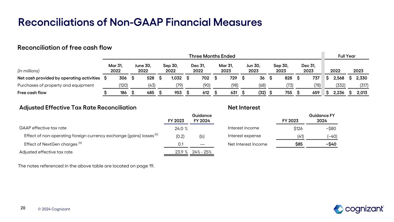 © 2024 Cognizant Reconciliations of Non-GAAP Financial Measures Notes: (a) NextGen charges for the three months ended December 31, 2023 include $22 million of employee separation costs, $16 million of facility exit costs and $2 million of third party and other costs. NextGen charges for the year ended December 31, 2023 include $115 million of employee separation costs, $108 million of facility exit costs and $6 million of third party and other costs. In 2024, we expect to incur $70 million of expenses in connection with the NextGen program, which is expected to bring the total charges under the program to approximately $300  million. The total costs related to the NextGen program are reported in "Restructuring charges" in our audited consolidated statements of operations. Our guidance anticipates pre-tax charges of approximately $0.14 per diluted share for the full year 2024. The tax effect of these charges is expected to be approximately $0.04 per diluted share for the full year 2024. (b) Non-operating foreign currency exchange gains and losses, inclusive of gains and losses related to foreign exchange forward contracts not designated as hedging instruments for accounting purposes, are reported in "Foreign currency exchange gains (losses), net" in our unaudited consolidated statements of operations. Non-operating foreign currency exchange gains and losses are subject to high variability and low visibility and therefore cannot be provided on a forward-looking basis without unreasonable efforts. 19 (d) During the three months ended September 30, 2022, we recognized an income tax benefit previously unrecognized in our consolidated financial statements related to a specific uncertain tax position of $36 million. The recognition of the benefit in the third quarter of 2022 was based on management’s reassessment regarding whether this unrecognized tax benefit met the more-likely-than-not threshold in light of the lapse in the statute of limitations as to a portion of such benefit. 2022 2023 FY Three months ended: Mar 31 Jun 30 Sep 30 Dec 31 Mar 31 Jun 30 Sep 30 Dec 31 2022 2023 Non-GAAP income tax benefit (expense) related to: NextGen charges $ — $ — $ — $ — $ — $ 31 $ 18 $ 10 $ — 59 Tax impact of foreign currency exchange gain and losses (6) (14) (15) (4) 5 — (7) (4) (39) (6) (c) Presented below are the tax impacts of our non-GAAP adjustments to pre-tax income: The effective tax rate related to non-operating foreign currency exchange gains and losses varies depending on the jurisdictions in which such income and expenses are generated and the statutory rates applicable in those jurisdictions. As such, the income tax effect of non-operating foreign currency exchange gains and losses shown in the above table may not appear proportionate to the net pre-tax foreign currency exchange gains and losses reported in our consolidated statements of operations.