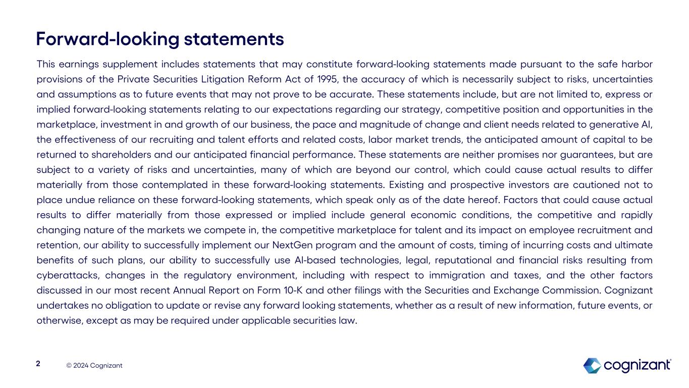 © 2024 Cognizant Forward-looking statements This earnings supplement includes statements that may constitute forward-looking statements made pursuant to the safe harbor provisions of the Private Securities Litigation Reform Act of 1995, the accuracy of which is necessarily subject to risks, uncertainties and assumptions as to future events that may not prove to be accurate. These statements include, but are not limited to, express or implied forward-looking statements relating to our expectations regarding our strategy, competitive position and opportunities in the marketplace, investment in and growth of our business, the pace and magnitude of change and client needs related to generative AI, the effectiveness of our recruiting and talent efforts and related costs, labor market trends, the anticipated amount of capital to be returned to shareholders and our anticipated financial performance. These statements are neither promises nor guarantees, but are subject to a variety of risks and uncertainties, many of which are beyond our control, which could cause actual results to differ materially from those contemplated in these forward-looking statements. Existing and prospective investors are cautioned not to place undue reliance on these forward-looking statements, which speak only as of the date hereof. Factors that could cause actual results to differ materially from those expressed or implied include general economic conditions, the competitive and rapidly changing nature of the markets we compete in, the competitive marketplace for talent and its impact on employee recruitment and retention, our ability to successfully implement our NextGen program and the amount of costs, timing of incurring costs and ultimate benefits of such plans, our ability to successfully use AI-based technologies, legal, reputational and financial risks resulting from cyberattacks, changes in the regulatory environment, including with respect to immigration and taxes, and the other factors discussed in our most recent Annual Report on Form 10-K and other filings with the Securities and Exchange Commission. Cognizant undertakes no obligation to update or revise any forward looking statements, whether as a result of new information, future events, or otherwise, except as may be required under applicable securities law. 2