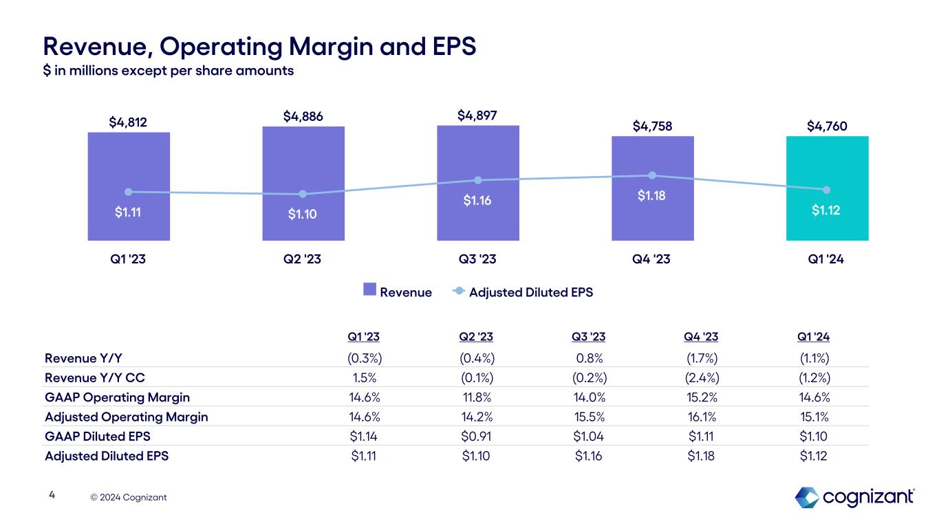 © 2024 Cognizant $729M $95M Q1 '23 Q1 '24 Results Summary: Q1 2024 1 See “About Non-GAAP Financial Measures and Performance Metrics” at the end of this earnings supplement for more information and reconciliations to the most directly comparable GAAP financial measures, as applicable. 2 Operating Cash Flow and Free Cash Flow include the negative impact from a previously disclosed $360 million payment made to the India tax authorities in connection with our ongoing appeal of a 2016 tax matter. Revenue Decline of 1.1% Y/Y as reported, and a decline of 1.2% Y/Y in constant currency1 GAAP and Adjusted Operating Margin1 Cash Flow2 3 $4,812M $4,760M Q1 '23 Q1 '24 14.6% 14.6% Q1 '23 Q1 '24 14.6% 15.1% Q1 '23 Q1 '24 $631M $16M Q1 '23 Q1 '24 $1.14 $1.10 Q1 '23 Q1 '24 $1.11 $1.12 Q1 '23 Q1 '24 Adjusted Operating Margin1 GAAP Diluted EPS Adjusted Diluted EPS1 Operating Cash Flow Free Cash Flow1 GAAP Operating Margin Adjusted Operating Margin1 Diluted Earnings Per Share (EPS)