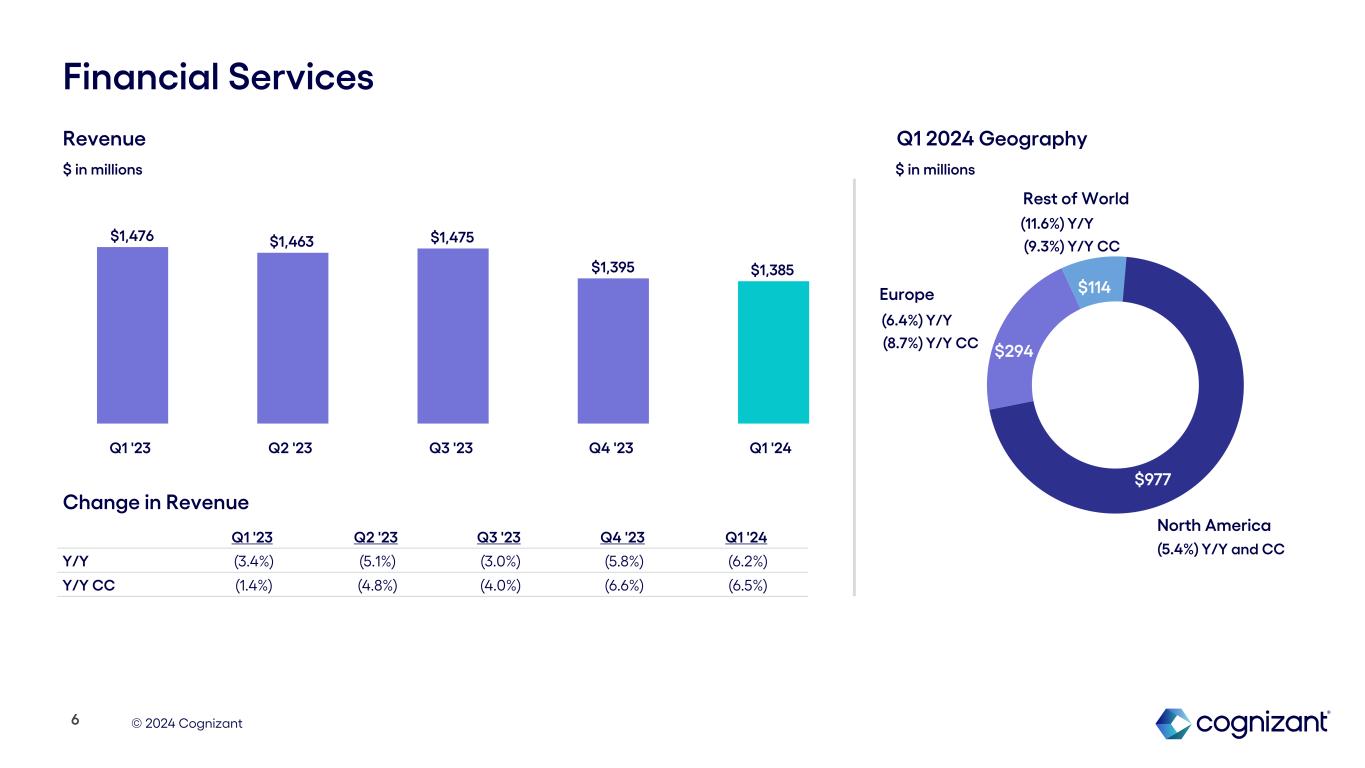 © 2024 Cognizant $3,521 $939 $300 $1,385 $1,416 $1,133 $826 Revenue Performance: Q1 2024 Products & Resources Communications, Media & Technology Health Sciences Financial Services North America Europe Rest of World Segments $ in millions Geography $ in millions +5.2% Y/Y +5.7% Y/Y CC +1.3% Y/Y +0.9% Y/Y CC (1.2%) Y/Y (1.3%) Y/Y CC (6.2%) Y/Y (6.5%) Y/Y CC 0.0% Y/Y (2.4%) Y/Y CC (8.5%) Y/Y (3.7%) Y/Y CC (0.7%) Y/Y and Y/Y CC 5