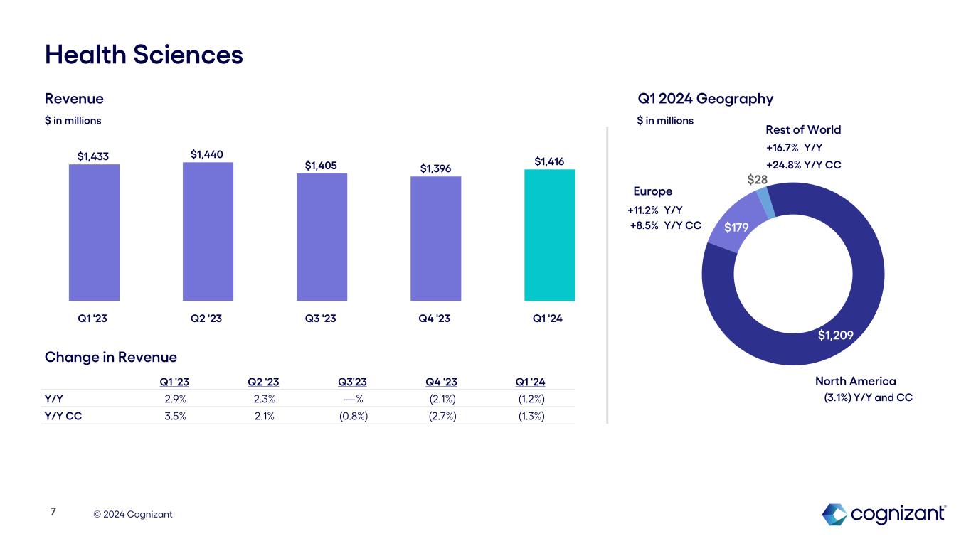 © 2024 Cognizant $977 $294 $114 Financial Services North America Europe Rest of World Q1 '23 Q2 '23 Q3 '23 Q4 '23 Q1 '24 Y/Y (3.4%) (5.1%) (3.0%) (5.8%) (6.2%) Y/Y CC (1.4%) (4.8%) (4.0%) (6.6%) (6.5%) (11.6%) Y/Y (9.3%) Y/Y CC (6.4%) Y/Y (8.7%) Y/Y CC Revenue Change in Revenue $ in millions $ in millions Q1 2024 Geography (5.4%) Y/Y and CC $1,476 $1,463 $1,475 $1,395 $1,385 Q1 '23 Q2 '23 Q3 '23 Q4 '23 Q1 '24 6 1 The sale of the Samlink subsidiary, which was completed on February 1, 2022, impacted our Q1, Q2, Q3 and Q4 2022 Y/Y revenue growth in total Financial Services by -1.3, -1.9, -1.8 and -1.8 percentage points.