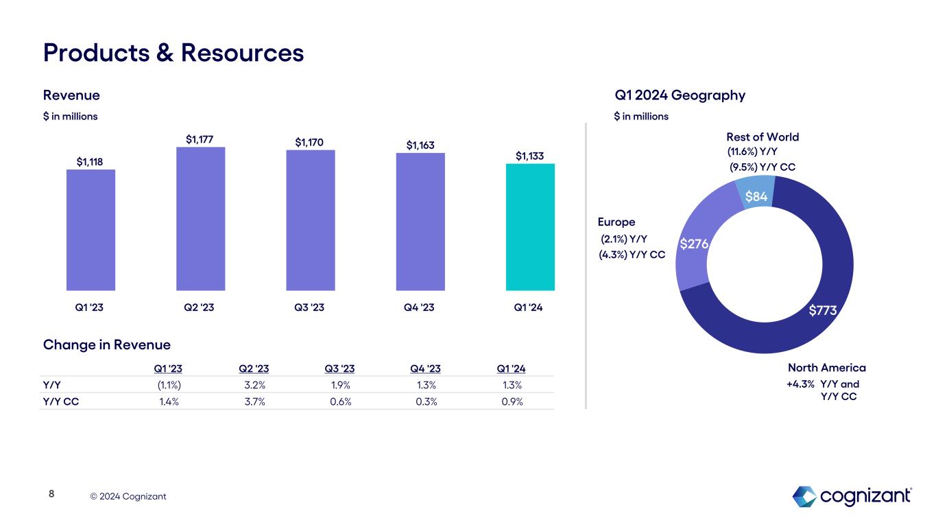 © 2024 Cognizant $1,209 $179 $28 Health Sciences North America Europe Rest of World +16.7% Y/Y +24.8% Y/Y CC +11.2% Y/Y +8.5% Y/Y CC (3.1%) Y/Y and CC Revenue $ in millions Q1 '23 Q2 '23 Q3'23 Q4 '23 Q1 '24 Y/Y 2.9% 2.3% —% (2.1%) (1.2%) Y/Y CC 3.5% 2.1% (0.8%) (2.7%) (1.3%) $1,433 $1,440 $1,405 $1,396 $1,416 Q1 '23 Q2 '23 Q3 '23 Q4 '23 Q1 '24 7 Change in Revenue $ in millions Q1 2024 Geography