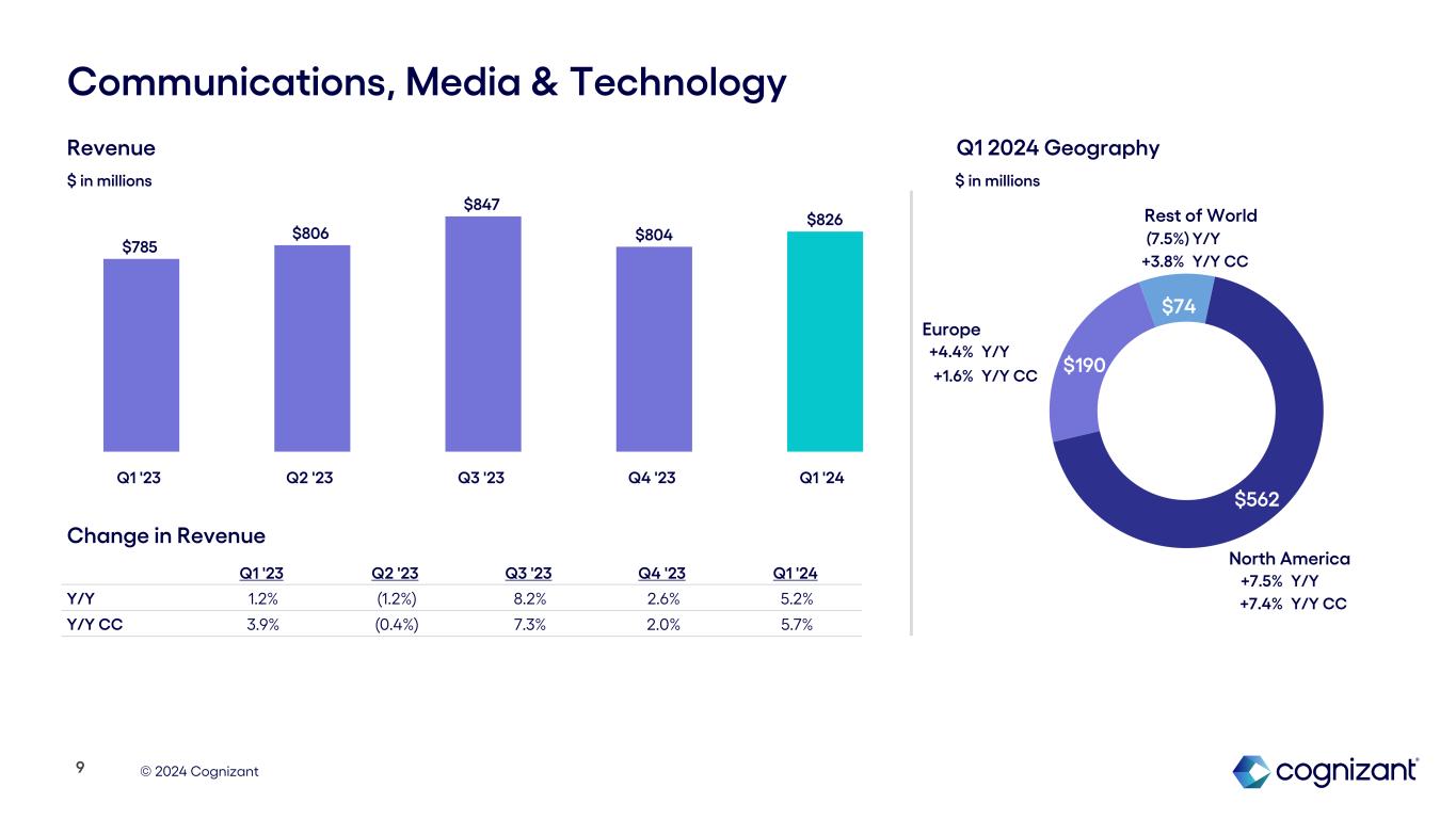 © 2024 Cognizant $773 $276 $84 North America Europe Products & Resources +4.3% Y/Y and Y/Y CC (2.1%) Y/Y (4.3%) Y/Y CC (11.6%) Y/Y (9.5%) Y/Y CC Rest of World Revenue $ in millions Q1 '23 Q2 '23 Q3 '23 Q4 '23 Q1 '24 Y/Y (1.1%) 3.2% 1.9% 1.3% 1.3% Y/Y CC 1.4% 3.7% 0.6% 0.3% 0.9% $1,118 $1,177 $1,170 $1,163 $1,133 Q1 '23 Q2 '23 Q3 '23 Q4 '23 Q1 '24 8 Change in Revenue $ in millions Q1 2024 Geography