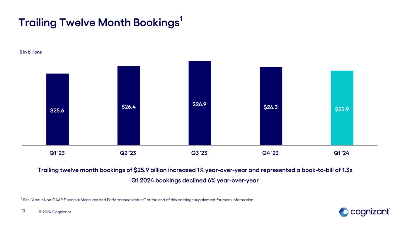© 2024 Cognizant $562 $190 $74 $785 $806 $847 $804 $826 Q1 '23 Q2 '23 Q3 '23 Q4 '23 Q1 '24 Communications, Media & Technology North America Rest of World (7.5%) Y/Y +3.8% Y/Y CC +4.4% Y/Y +1.6% Y/Y CC +7.5% Y/Y +7.4% Y/Y CC Europe Q1 '23 Q2 '23 Q3 '23 Q4 '23 Q1 '24 Y/Y 1.2% (1.2%) 8.2% 2.6% 5.2% Y/Y CC 3.9% (0.4%) 7.3% 2.0% 5.7% 9 Change in Revenue Revenue $ in millions $ in millions Q1 2024 Geography