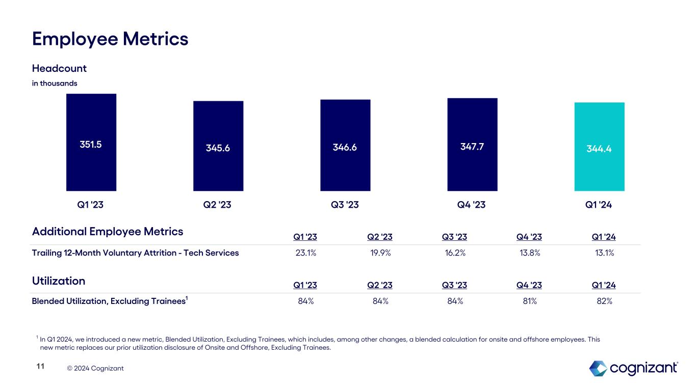 © 2024 Cognizant $25.6 $26.4 $26.9 $26.3 $25.9 Q1 '23 Q2 '23 Q3 '23 Q4 '23 Q1 '24 Trailing Twelve Month Bookings1 10 Trailing twelve month bookings of $25.9 billion increased 1% year-over-year and represented a book-to-bill of 1.3x Q1 2024 bookings declined 6% year-over-year $ in billions 1 See “About Non-GAAP Financial Measures and Performance Metrics” at the end of this earnings supplement for more information.