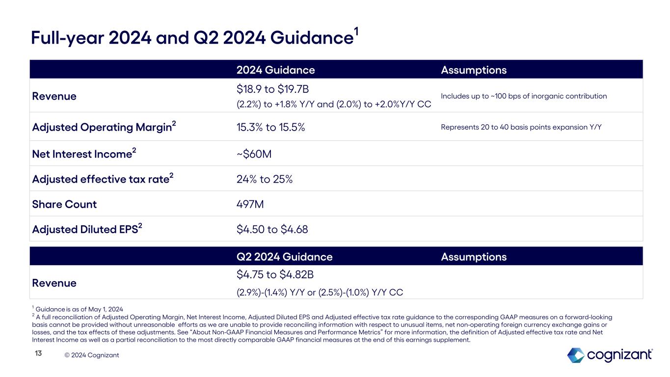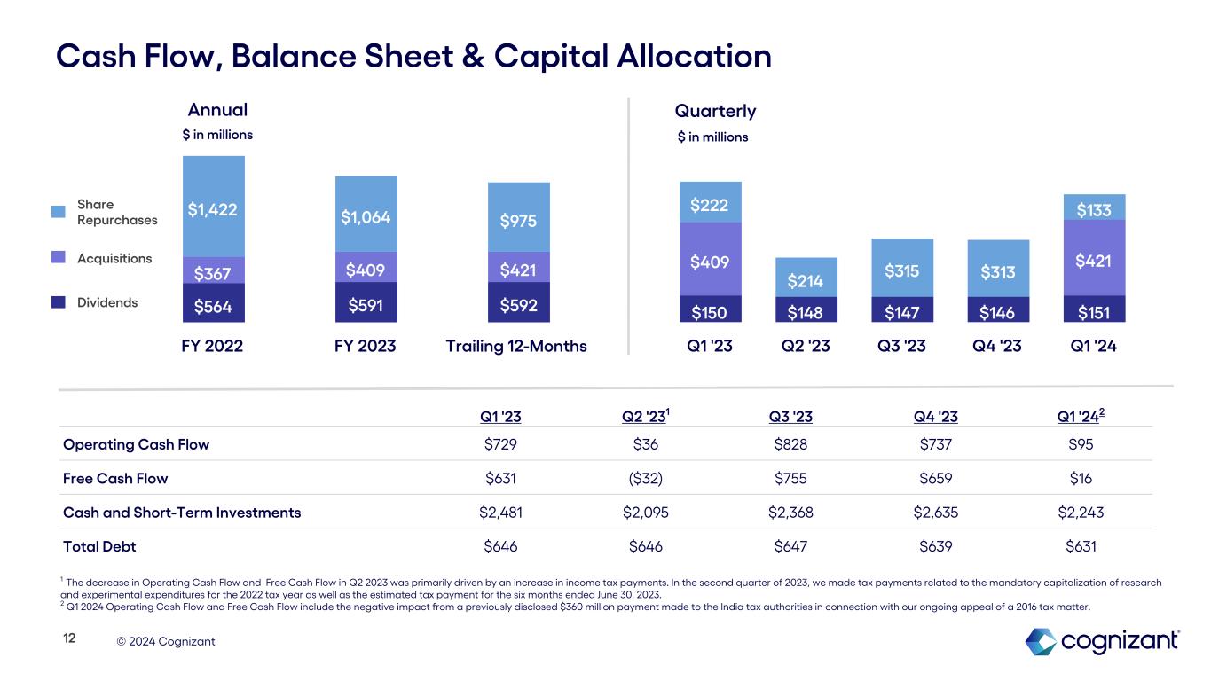 © 2024 Cognizant $564 $591 $592 $367 $409 $421 $1,422 $1,064 $975 FY 2022 FY 2023 Trailing 12-Months Acquisitions Share Repurchases $150 $148 $147 $146 $151 $409 $421 $222 $214 $315 $313 $133 Q1 '23 Q2 '23 Q3 '23 Q4 '23 Q1 '24 Cash Flow, Balance Sheet & Capital Allocation Q1 '23 Q2 '231 Q3 '23 Q4 '23 Q1 '242 Operating Cash Flow $729 $36 $828 $737 $95 Free Cash Flow $631 ($32) $755 $659 $16 Cash and Short-Term Investments $2,481 $2,095 $2,368 $2,635 $2,243 Total Debt $646 $646 $647 $639 $631 Annual Quarterly Dividends 12 $ in millions $ in millions 1 The decrease in Operating Cash Flow and Free Cash Flow in Q2 2023 was primarily driven by an increase in income tax payments. In the second quarter of 2023, we made tax payments related to the mandatory capitalization of research and experimental expenditures for the 2022 tax year as well as the estimated tax payment for the six months ended June 30, 2023. 2 Q1 2024 Operating Cash Flow and Free Cash Flow include the negative impact from a previously disclosed $360 million payment made to the India tax authorities in connection with our ongoing appeal of a 2016 tax matter.