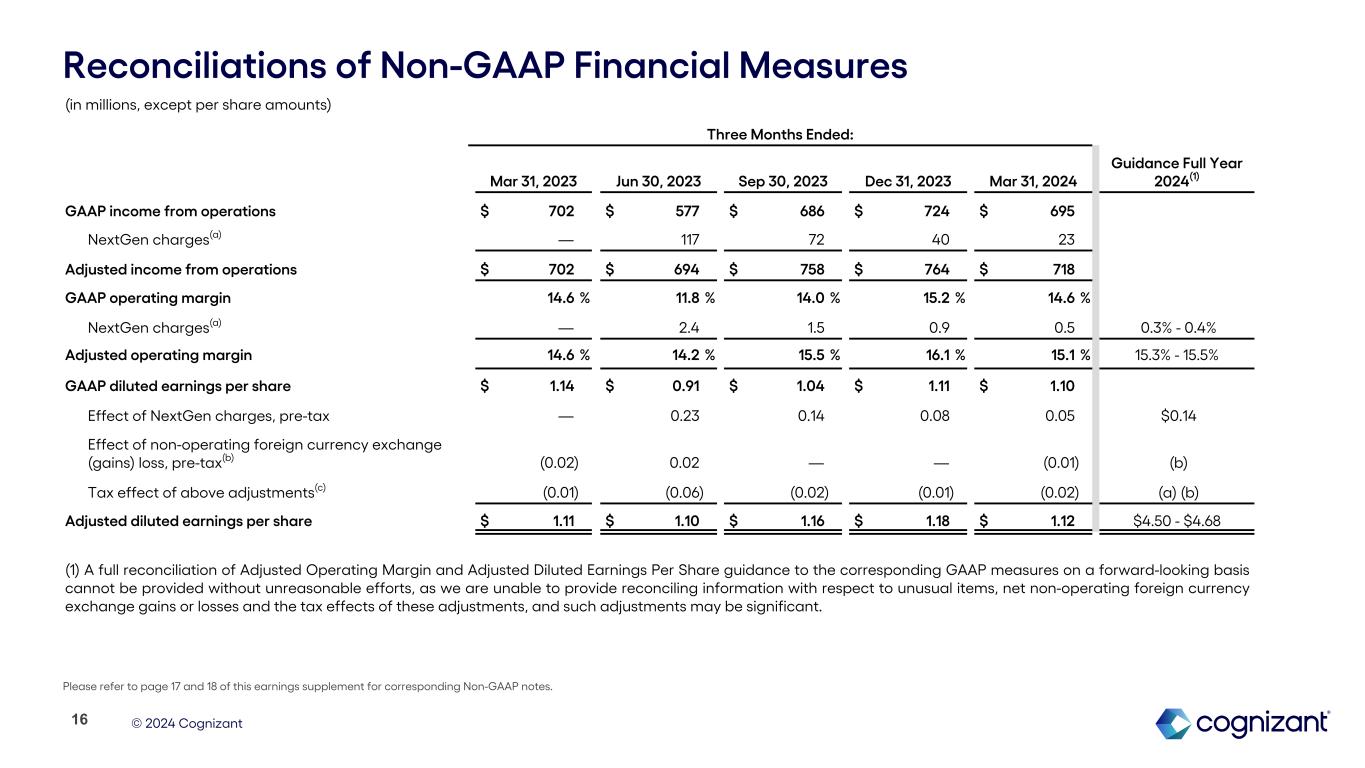 © 2024 Cognizant Non-GAAP Financial Measures To supplement our financial results presented in accordance with GAAP, this earnings supplement includes references to the following measures defined by the Securities and Exchange Commission as non-GAAP financial measures: Adjusted Operating Margin, Adjusted Diluted EPS, free cash flow, constant currency revenue growth, Adjusted effective tax rate and net interest income. These non-GAAP financial measures are not based on any comprehensive set of accounting rules or principles and should not be considered a substitute for, or superior to, financial measures calculated in accordance with GAAP, and may be different from non-GAAP financial measures used by other companies. In addition, these non-GAAP financial measures should be read in conjunction with our financial statements prepared in accordance with GAAP. The reconciliations of our non-GAAP financial measures to the corresponding GAAP measures should be carefully evaluated. Our non-GAAP financial measures Adjusted Operating Margin and Adjusted Income from Operations excludes unusual items, such as NextGen charges. Our non-GAAP financial measure Adjusted Diluted EPS excludes unusual items, such as NextGen charges, and net non-operating foreign currency exchange gains or losses and the tax impact of all the applicable adjustments. The income tax impact of each item excluded from Adjusted Diluted EPS is calculated by applying the statutory rate and local tax regulations in the jurisdiction in which the item was incurred. Free cash flow is defined as cash flows from operating activities net of purchases of property and equipment. Constant currency revenue growth is defined as revenues for a given period restated at the comparative period’s foreign currency exchange rates measured against the comparative period's reported revenues. Adjusted effective tax rate reflects a tax rate commensurate with our non-GAAP Adjusted EPS. Net Interest Income is defined as interest income less interest expense. Management believes providing investors with an operating view consistent with how we manage the Company provides enhanced transparency into our operating results. For our internal management reporting and budgeting purposes, we use various GAAP and non-GAAP financial measures for financial and operational decision-making, to evaluate period-to-period comparisons, to determine portions of the compensation for our executive officers and for making comparisons of our operating results to those of our competitors. Accordingly, we believe that the presentation of our non-GAAP measures, which exclude certain costs, when read in conjunction with our reported GAAP results, can provide useful supplemental information to our management and investors regarding financial and business trends relating to our financial condition and results of operations. A limitation of using non-GAAP financial measures versus financial measures calculated in accordance with GAAP is that non-GAAP financial measures do not reflect all of the amounts associated with our operating results as determined in accordance with GAAP and may exclude costs that are recurring such as our net non-operating foreign currency exchange gains or losses. In addition, other companies may calculate non-GAAP financial measures differently than us, thereby limiting the usefulness of these non-GAAP financial measures as a comparative tool. We compensate for these limitations by providing specific information regarding the GAAP amounts excluded from our non-GAAP financial measures to allow investors to evaluate such non-GAAP financial measures. Performance Metrics Bookings are defined as total contract value (or TCV) of new contracts, including new contract sales as well as renewals and expansions of existing contracts. Bookings can vary significantly quarter to quarter depending in part on the timing of the signing of a small number of large contracts. Our book-to-bill ratio is defined as bookings for the trailing twelve months divided by revenue for the same period. Measuring bookings involves the use of estimates and judgments and there are no independent standards or requirements governing the calculation of bookings. The extent and timing of conversion of bookings to revenues may be impacted by, among other factors, the types of services and solutions sold, contract duration, the pace of client spending, actual volumes of services delivered as compared to the volumes anticipated at the time of sale, and contract modifications, including terminations, over the lifetime of a contract. The majority of our contracts are terminable by the client on short notice often without penalty, and some without notice. We do not update our bookings for subsequent terminations, reductions or foreign currency exchange rate fluctuations. Information regarding our bookings is not comparable to, nor should it be substituted for, an analysis of our reported revenues. However, management believes that it is a key indicator of potential future revenues and provides a useful indicator of the volume of our business over time. About Non-GAAP Financial Measures and Performance Metrics 15
