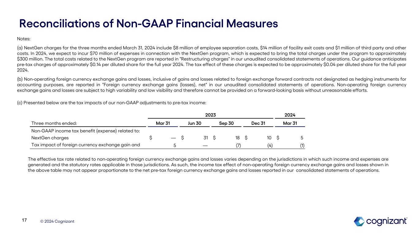 © 2024 Cognizant Reconciliations of Non-GAAP Financial Measures Please refer to page 17 and 18 of this earnings supplement for corresponding Non-GAAP notes. 16 (in millions, except per share amounts) Three Months Ended: Mar 31, 2023 Jun 30, 2023 Sep 30, 2023 Dec 31, 2023 Mar 31, 2024 Guidance Full Year 2024(1) GAAP income from operations $ 702 $ 577 $ 686 $ 724 $ 695 NextGen charges(a) — 117 72 40 23 Adjusted income from operations $ 702 $ 694 $ 758 $ 764 $ 718 GAAP operating margin 14.6 % 11.8 % 14.0 % 15.2 % 14.6 % NextGen charges(a) — 2.4 1.5 0.9 0.5 0.3% - 0.4% Adjusted operating margin 14.6 % 14.2 % 15.5 % 16.1 % 15.1 % 15.3% - 15.5% GAAP diluted earnings per share $ 1.14 $ 0.91 $ 1.04 $ 1.11 $ 1.10 Effect of NextGen charges, pre-tax — 0.23 0.14 0.08 0.05 $0.14 Effect of non-operating foreign currency exchange (gains) loss, pre-tax(b) (0.02) 0.02 — — (0.01) (b) Tax effect of above adjustments(c) (0.01) (0.06) (0.02) (0.01) (0.02) (a) (b) Adjusted diluted earnings per share $ 1.11 $ 1.10 $ 1.16 $ 1.18 $ 1.12 $4.50 - $4.68 (1) A full reconciliation of Adjusted Operating Margin and Adjusted Diluted Earnings Per Share guidance to the corresponding GAAP measures on a forward-looking basis cannot be provided without unreasonable efforts, as we are unable to provide reconciling information with respect to unusual items, net non-operating foreign currency exchange gains or losses and the tax effects of these adjustments, and such adjustments may be significant.