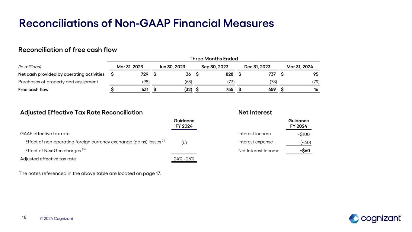 © 2024 Cognizant Reconciliations of Non-GAAP Financial Measures Notes: (a) NextGen charges for the three months ended March 31, 2024 include $8 million of employee separation costs, $14 million of facility exit costs and $1 million of third party and other costs. In 2024, we expect to incur $70 million of expenses in connection with the NextGen program, which is expected to bring the total charges under the program to approximately $300 million. The total costs related to the NextGen program are reported in "Restructuring charges" in our unaudited consolidated statements of operations. Our guidance anticipates pre-tax charges of approximately $0.14 per diluted share for the full year 2024. The tax effect of these charges is expected to be approximately $0.04 per diluted share for the full year 2024. (b) Non-operating foreign currency exchange gains and losses, inclusive of gains and losses related to foreign exchange forward contracts not designated as hedging instruments for accounting purposes, are reported in "Foreign currency exchange gains (losses), net" in our unaudited consolidated statements of operations. Non-operating foreign currency exchange gains and losses are subject to high variability and low visibility and therefore cannot be provided on a forward-looking basis without unreasonable efforts. 17 2023 2024 Three months ended: Mar 31 Jun 30 Sep 30 Dec 31 Mar 31 Non-GAAP income tax benefit (expense) related to: NextGen charges $ — $ 31 $ 18 $ 10 $ 5 Tax impact of foreign currency exchange gain and losses 5 — (7) (4) (1) (c) Presented below are the tax impacts of our non-GAAP adjustments to pre-tax income: The effective tax rate related to non-operating foreign currency exchange gains and losses varies depending on the jurisdictions in which such income and expenses are generated and the statutory rates applicable in those jurisdictions. As such, the income tax effect of non-operating foreign currency exchange gains and losses shown in the above table may not appear proportionate to the net pre-tax foreign currency exchange gains and losses reported in our consolidated statements of operations.